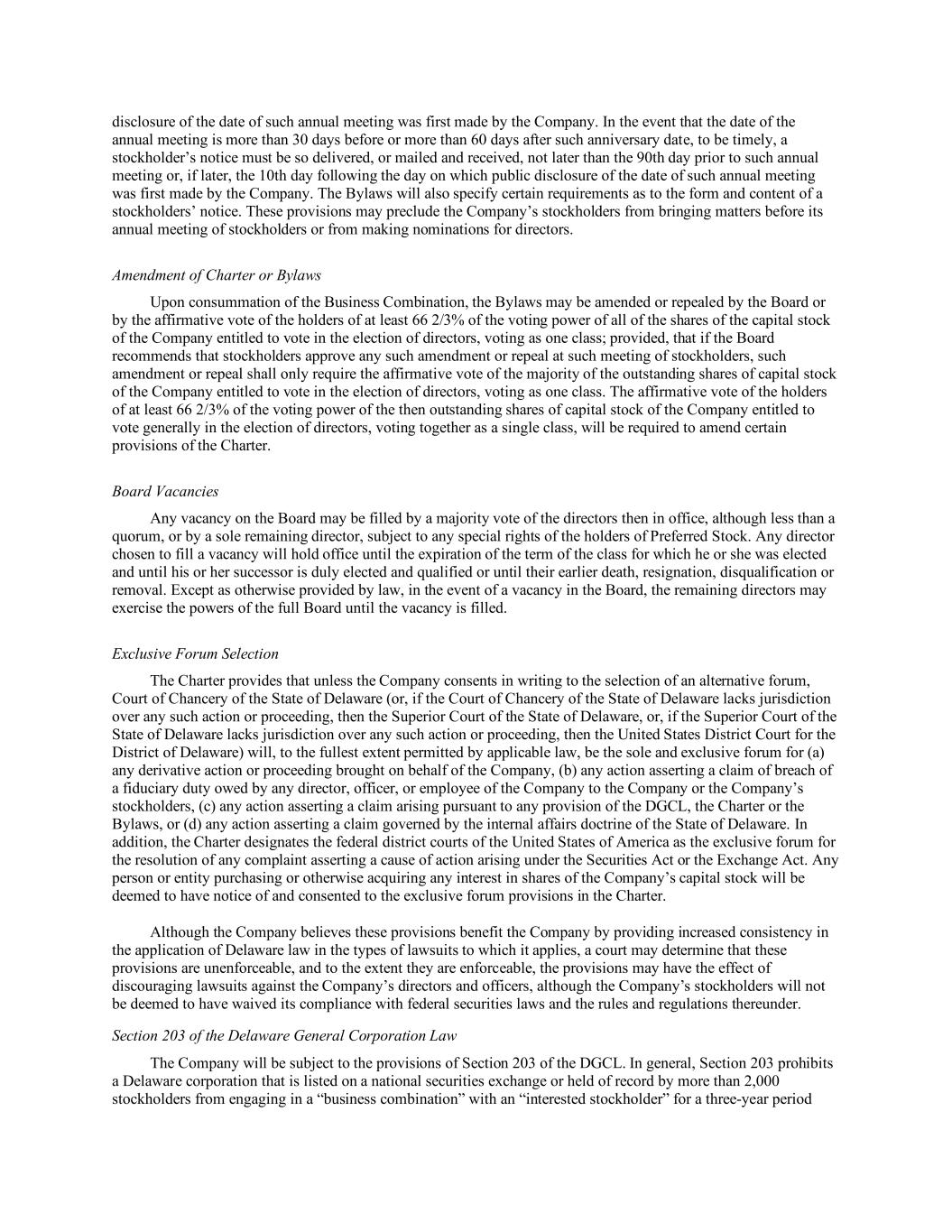 disclosure of the date of such annual meeting was first made by the Company. In the event that the date of the annual meeting is more than 30 days before or more than 60 days after such anniversary date, to be timely, a stockholder’s notice must be so delivered, or mailed and received, not later than the 90th day prior to such annual meeting or, if later, the 10th day following the day on which public disclosure of the date of such annual meeting was first made by the Company. The Bylaws will also specify certain requirements as to the form and content of a stockholders’ notice. These provisions may preclude the Company’s stockholders from bringing matters before its annual meeting of stockholders or from making nominations for directors. Amendment of Charter or Bylaws Upon consummation of the Business Combination, the Bylaws may be amended or repealed by the Board or by the affirmative vote of the holders of at least 66 2/3% of the voting power of all of the shares of the capital stock of the Company entitled to vote in the election of directors, voting as one class; provided, that if the Board recommends that stockholders approve any such amendment or repeal at such meeting of stockholders, such amendment or repeal shall only require the affirmative vote of the majority of the outstanding shares of capital stock of the Company entitled to vote in the election of directors, voting as one class. The affirmative vote of the holders of at least 66 2/3% of the voting power of the then outstanding shares of capital stock of the Company entitled to vote generally in the election of directors, voting together as a single class, will be required to amend certain provisions of the Charter. Board Vacancies Any vacancy on the Board may be filled by a majority vote of the directors then in office, although less than a quorum, or by a sole remaining director, subject to any special rights of the holders of Preferred Stock. Any director chosen to fill a vacancy will hold office until the expiration of the term of the class for which he or she was elected and until his or her successor is duly elected and qualified or until their earlier death, resignation, disqualification or removal. Except as otherwise provided by law, in the event of a vacancy in the Board, the remaining directors may exercise the powers of the full Board until the vacancy is filled. Exclusive Forum Selection The Charter provides that unless the Company consents in writing to the selection of an alternative forum, Court of Chancery of the State of Delaware (or, if the Court of Chancery of the State of Delaware lacks jurisdiction over any such action or proceeding, then the Superior Court of the State of Delaware, or, if the Superior Court of the State of Delaware lacks jurisdiction over any such action or proceeding, then the United States District Court for the District of Delaware) will, to the fullest extent permitted by applicable law, be the sole and exclusive forum for (a) any derivative action or proceeding brought on behalf of the Company, (b) any action asserting a claim of breach of a fiduciary duty owed by any director, officer, or employee of the Company to the Company or the Company’s stockholders, (c) any action asserting a claim arising pursuant to any provision of the DGCL, the Charter or the Bylaws, or (d) any action asserting a claim governed by the internal affairs doctrine of the State of Delaware. In addition, the Charter designates the federal district courts of the United States of America as the exclusive forum for the resolution of any complaint asserting a cause of action arising under the Securities Act or the Exchange Act. Any person or entity purchasing or otherwise acquiring any interest in shares of the Company’s capital stock will be deemed to have notice of and consented to the exclusive forum provisions in the Charter. Although the Company believes these provisions benefit the Company by providing increased consistency in the application of Delaware law in the types of lawsuits to which it applies, a court may determine that these provisions are unenforceable, and to the extent they are enforceable, the provisions may have the effect of discouraging lawsuits against the Company’s directors and officers, although the Company’s stockholders will not be deemed to have waived its compliance with federal securities laws and the rules and regulations thereunder. Section 203 of the Delaware General Corporation Law The Company will be subject to the provisions of Section 203 of the DGCL. In general, Section 203 prohibits a Delaware corporation that is listed on a national securities exchange or held of record by more than 2,000 stockholders from engaging in a “business combination” with an “interested stockholder” for a three-year period