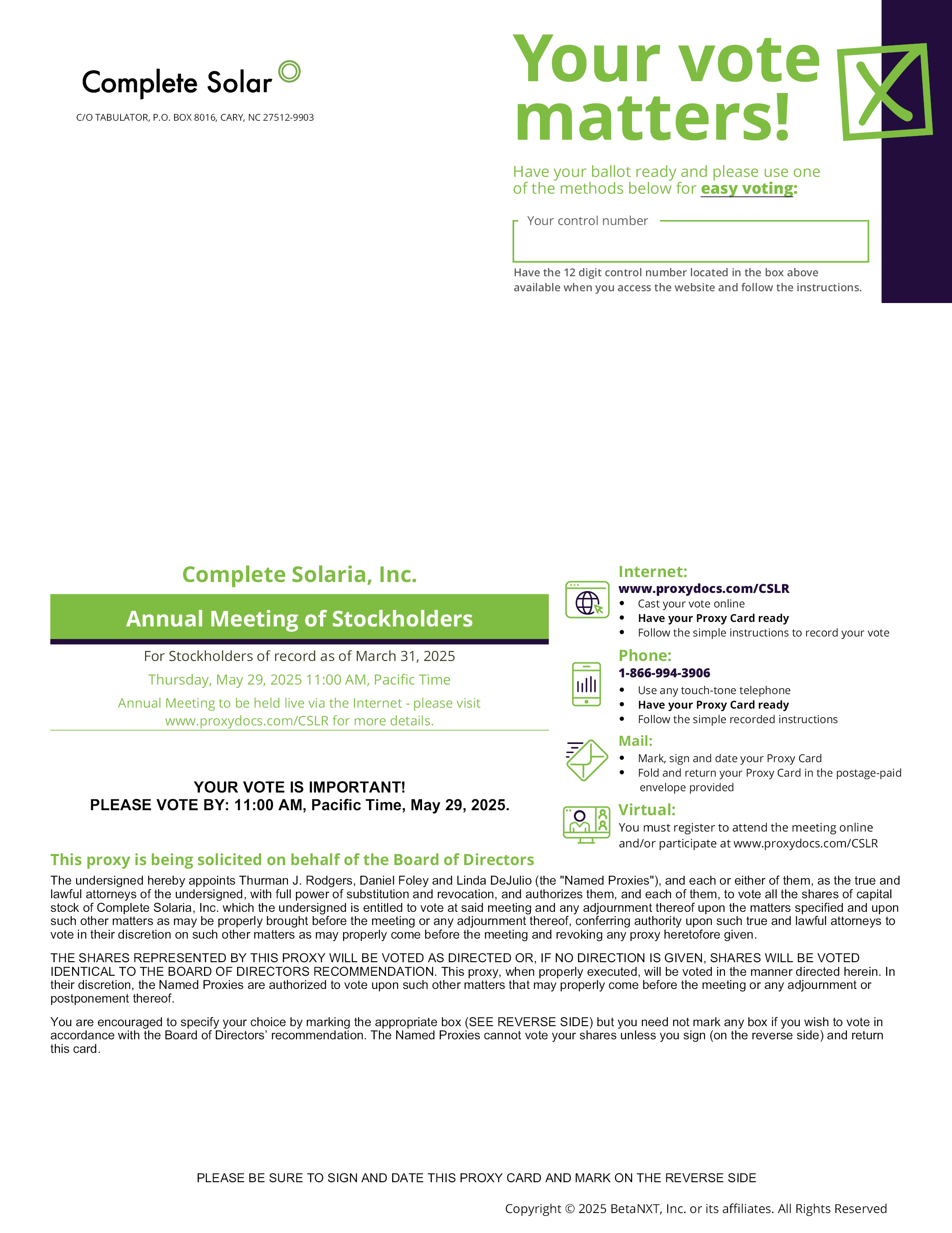 C/O TABULATOR, P.O. BOX 8016, CARY, NC 27512-9903 Your vote matters Have your ballot ready and please use one of the methods below for easy voting: Your control number Have the 12 digit control number located in the box above available when you access the website and follow the instructions. Complete Solaria, Inc. Annual Meeting of Stockholders Internet: www.proxydocs.com/CSLR Cast your vote online Have your Proxy Card ready Follow the simple instructions to record your vote For Stockholders of record as of March 31, 2025 Thursday, May 29, 2025 11:00 AM, Pacific Time Annual Meeting to be held live via the Internet - please visit www.proxydocs.com/CSLR for more details. Phone: 1-866-994-3906 Use any touch-tone telephone Have your Proxy Card ready Follow the simple recorded instructions Mail: Mark, sign and date your Proxy Card Fold and return your Proxy Card in the postage-paid envelope provided Virtual: You must register to attend the meeting online and/or participate at www.proxydocs.com/CSLR YOUR VOTE IS IMPORTANT PLEASE VOTE BY: 11:00 AM, Pacific Time, May 29, 2025. This proxy is being solicited on behalf of the Board of Directors The undersigned hereby appoints Thurman J. Rodgers, Daniel Foley and Linda DeJulio (the “Named Proxies”), and each or either of them, as the true and lawful attorneys of the undersigned, with full power of substitution and revocation, and authorizes them, and each of them, to vote all the shares of capital stock of Complete Solaria, Inc. which the undersigned is entitled to vote at said meeting and any adjournment thereof upon the matters specified and upon such other matters as may be properly brought before the meeting or any adjournment thereof, conferring authority upon such true and lawful attorneys to vote in their discretion on such other matters as may properly come before the meeting and revoking any proxy heretofore given. THE SHARES REPRESENTED BY THIS PROXY WILL BE VOTED AS DIRECTED OR, IF NO DIRECTION IS GIVEN, SHARES WILL BE VOTED IDENTICAL TO THE BOARD OF DIRECTORS RECOMMENDATION. This proxy, when properly executed, will be voted in the manner directed herein. In their discretion, the Named Proxies are authorized to vote upon such other matters that may properly come before the meeting or any adjournment or postponement thereof. You are encouraged to specify your choice by marking the appropriate box (SEE REVERSE SIDE) but you need not mark any box if you wish to vote in accordance with the Board of Directors’ recommendation. The Named Proxies cannot vote your shares unless you sign (on the reverse side) and return this card. PLEASE BE SURE TO SIGN AND DATE THIS PROXY CARD AND MARK ON THE REVERSE SIDE Copyright 2025 BetaNXT, Inc. or its affiliates. All Rights Reserved