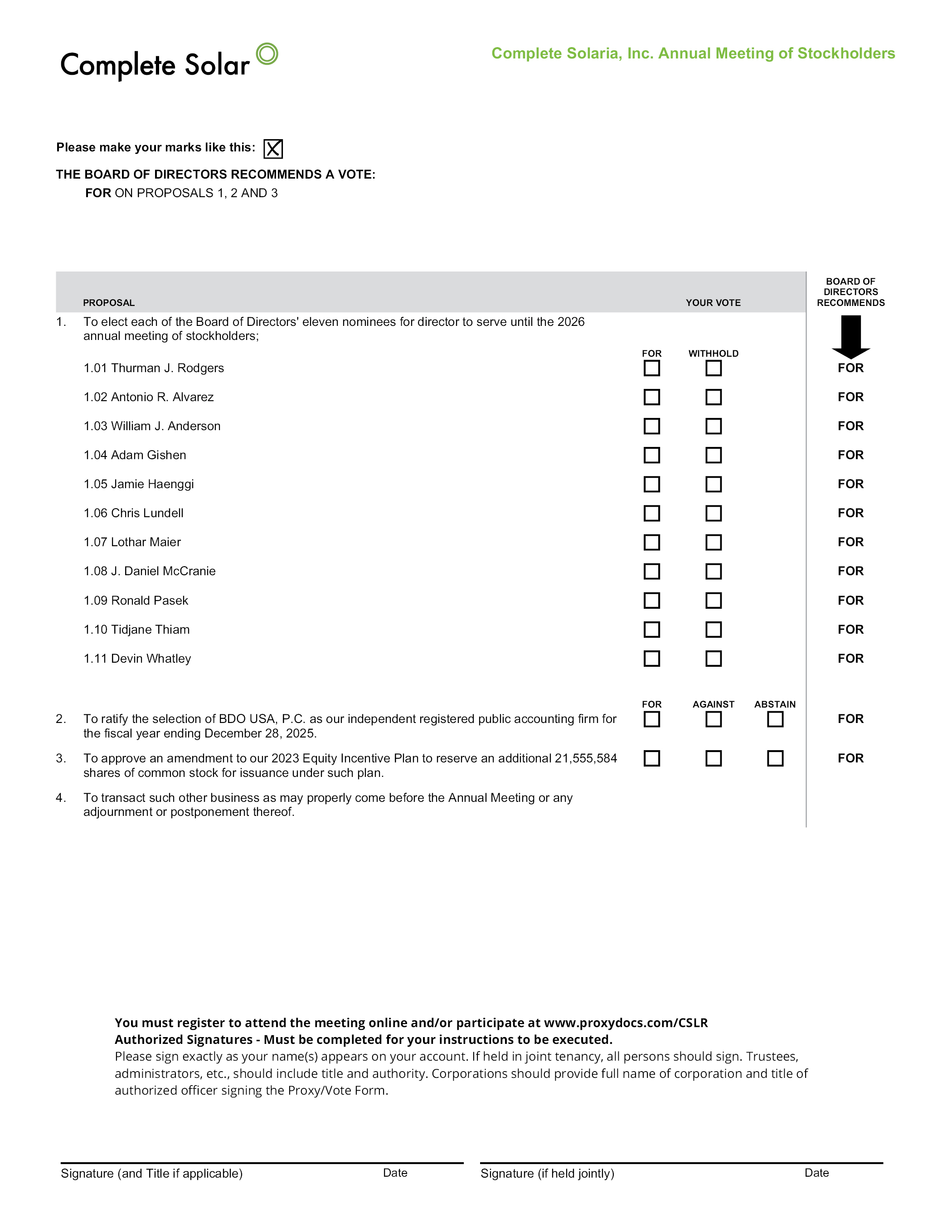 Complete Solaria, Inc. Annual Meeting of Stockholders Please make your marks like this: THE BOARD OF DIRECTORS RECOMMENDS A VOTE: FOR ON PROPOSALS 1, 2 AND 3 PROPOSAL YOUR VOTE BOARD OF DIRECTORS RECOMMENDS 1. To elect each of the Board of Directors’ eleven nominees for director to serve until the 2026 annual meeting of stockholders; 1.01 Thurman J. Rodgers FOR WITHHOLD 1.02 Antonio R. Alvarez 1.03 William J. Anderson 1.04 Adam Gishen 1.05 Jamie Haenggi 1.06 Chris Lundell 1.07 Lothar Maier 1.08 J. Daniel McCranie 1.09 Ronald Pasek 1.10 Tidjane Thiam 1.11 Devin Whatley FOR FOR FOR FOR FOR FOR FOR FOR FOR FOR FOR FOR AGAINST ABSTAIN 2. To ratify the selection of BDO USA, P.C. as our independent registered public accounting firm for the fiscal year ending December 28, 2025. 3. To approve an amendment to our 2023 Equity Incentive Plan to reserve an additional 21,555,584 shares of common stock for issuance under such plan. 4. To transact such other business as may properly come before the Annual Meeting or any adjournment or postponement thereof. FOR FOR You must register to attend the meeting online and/or participate at www.proxydocs.com/CSLR Authorized Signatures - Must be completed for your instructions to be executed. Please sign exactly as your name(s) appears on your account. If held in joint tenancy, all persons should sign. Trustees, administrators, etc., should include title and authority. Corporations should provide full name of corporation and title of authorized officer signing the Proxy/Vote Form. Signature (and Title if applicable) Date Signature (if held jointly) Date