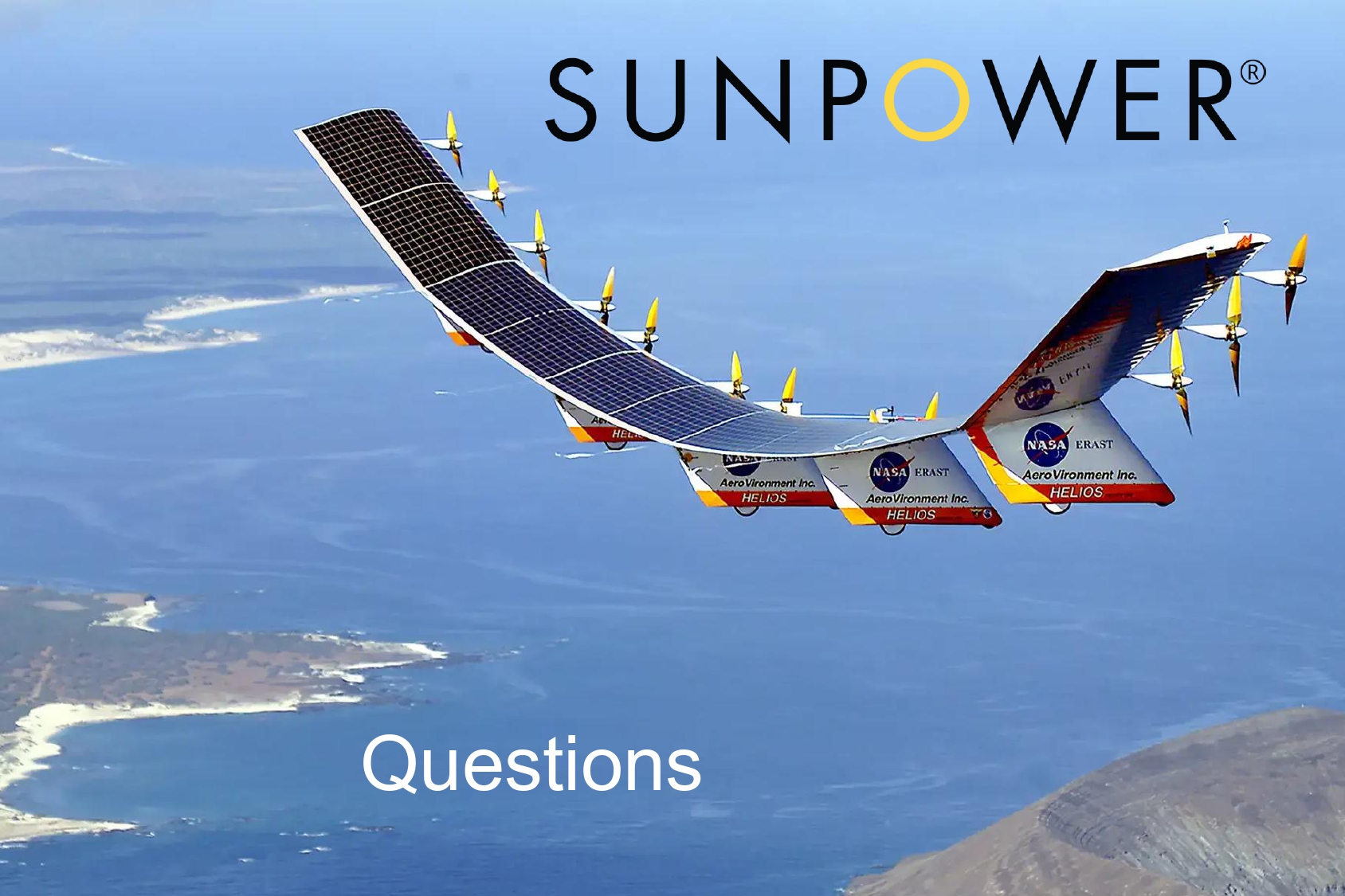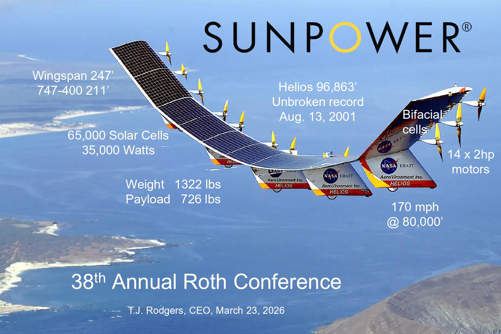 1 Wingspan 247’ 747 - 400 211’ Weight 1322 lbs Payload 726 lbs 170 mph @ 80,000’ 14 x 2hp motors 65,000 Solar Cells 35,000 Watts 38 th Annual Roth Conference T.J. Rodgers, CEO, March 23, 2026 Helios 96,863’ Unbroken record Aug. 13, 2001 Bifacial cells