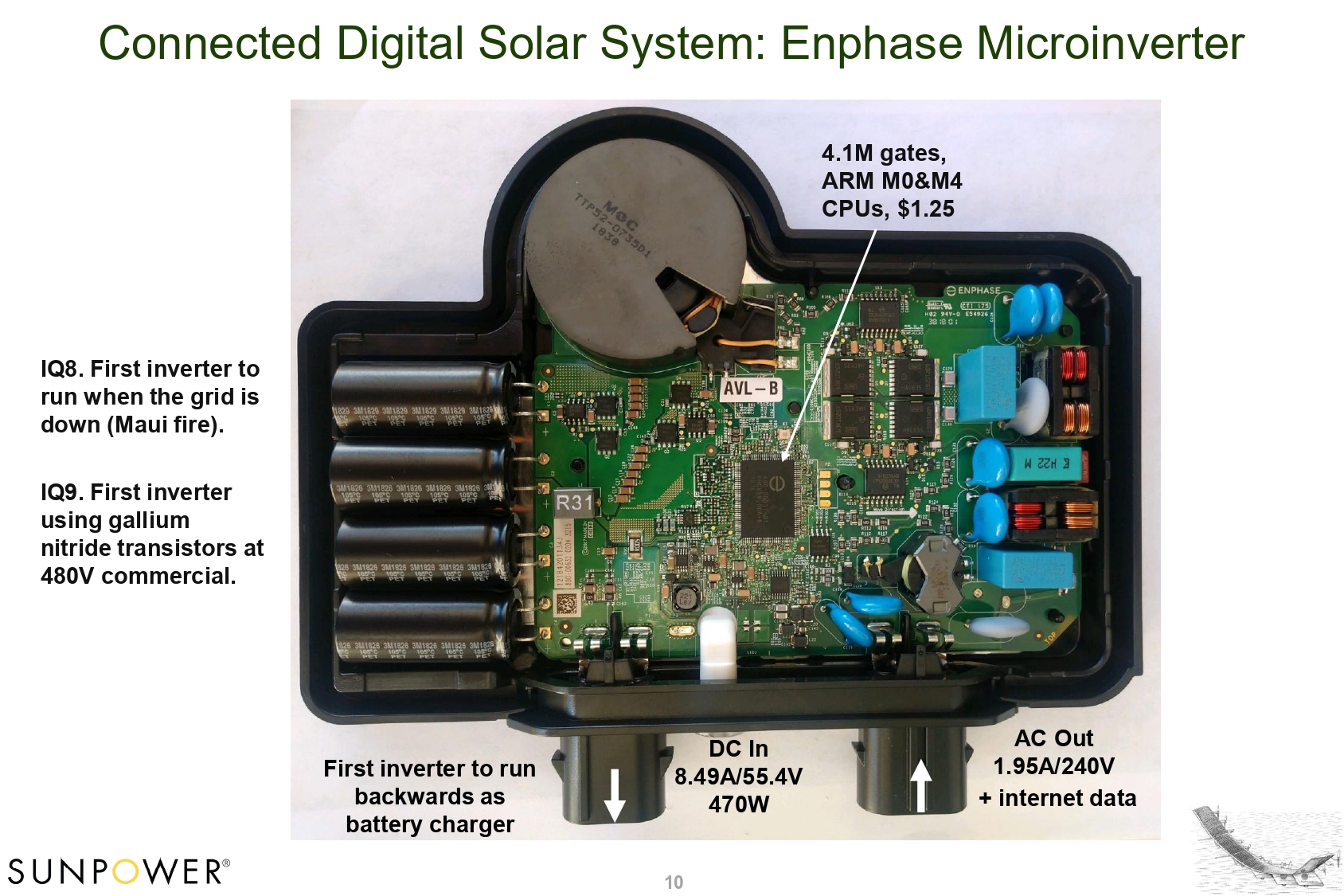 Connected Digital Solar System: Enphase Microinverter 4.1M gates, ARM M0&M4 CPUs, $1.25 DC In 8.49A/55.4V 470W 10 IQ 8 . First inverter to run when the grid is down (Maui fire) . IQ9. First inverter using gallium nitride transistors at 480V commercial. First inverter to run backwards as battery charger AC Out 1.95A/240V + internet data