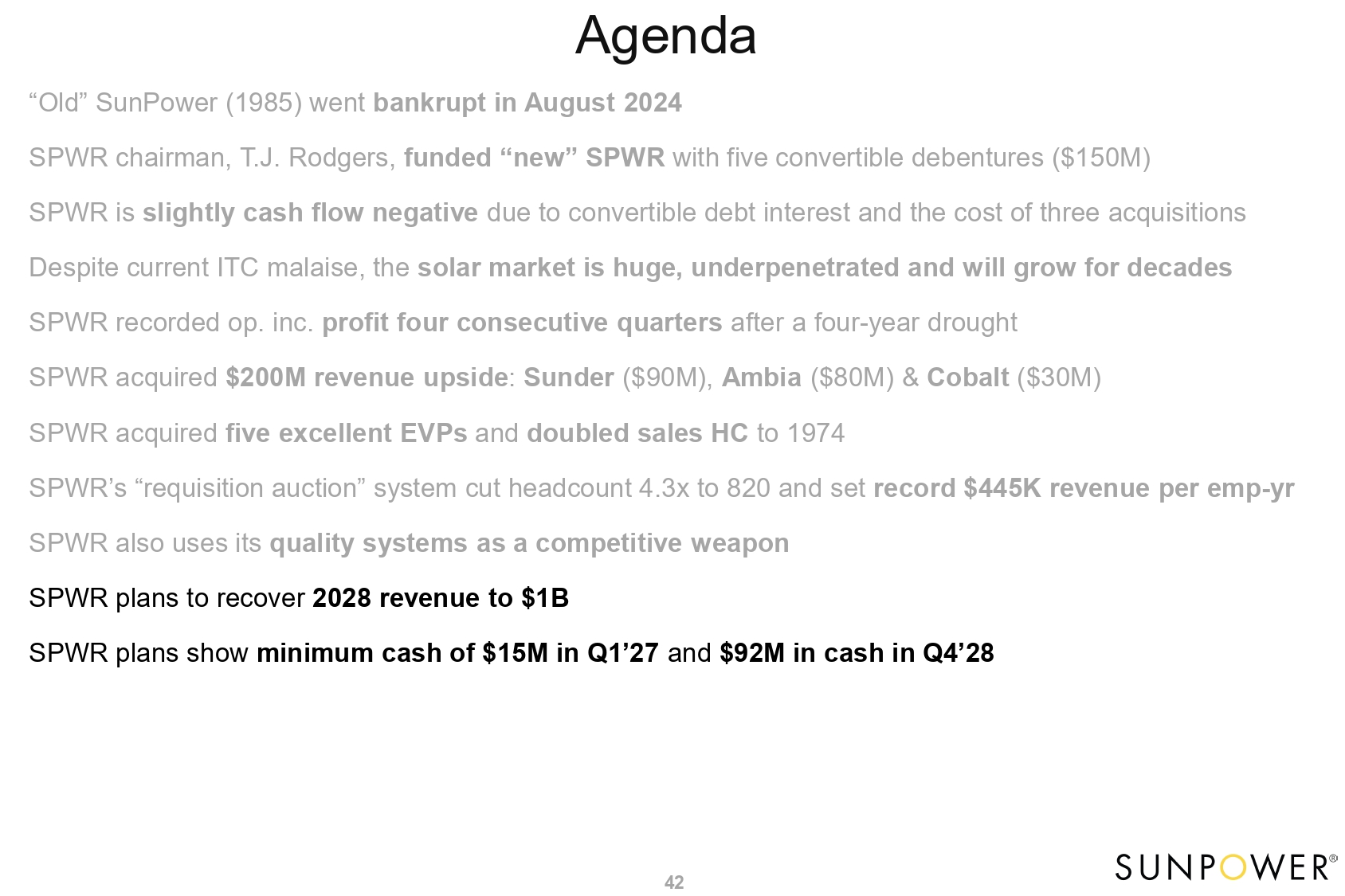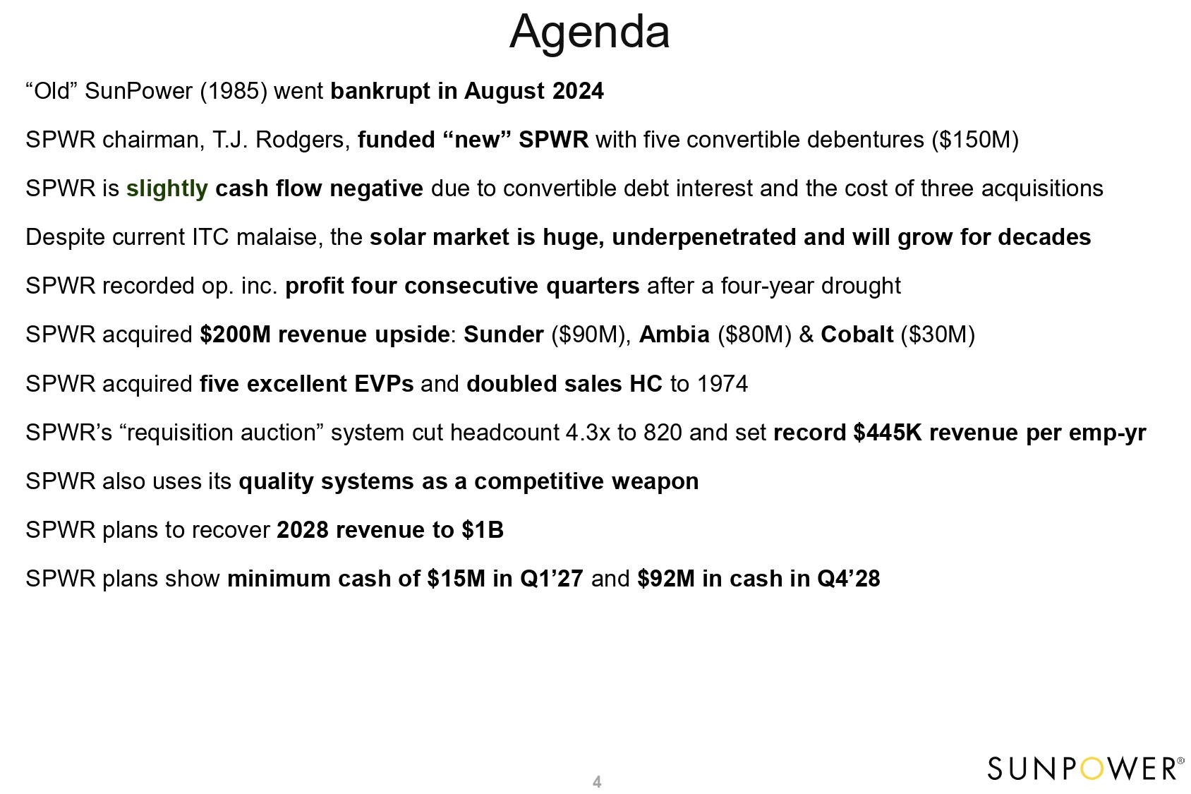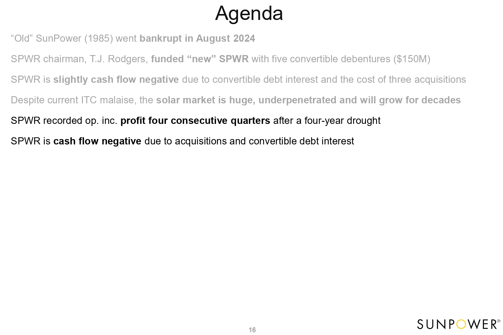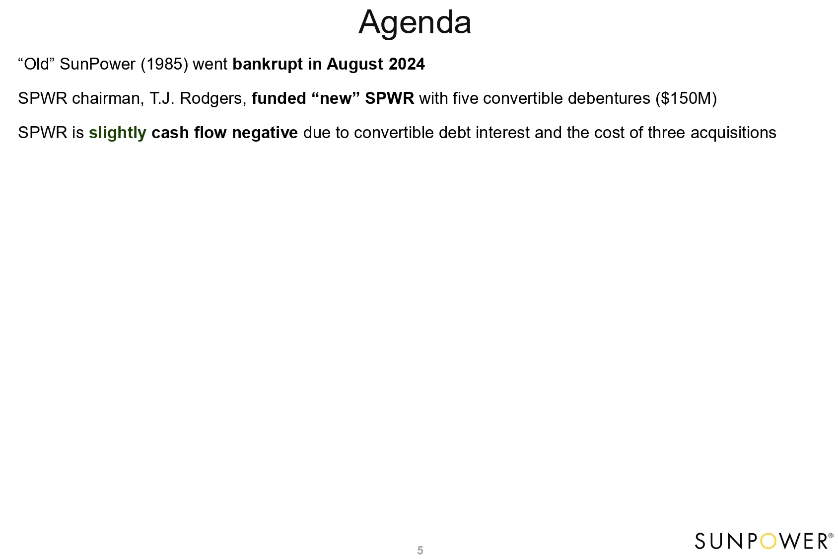 Agenda 5 “Old” SunPower (1985) went bankrupt in August 2024 SPWR chairman, T.J. Rodgers, funded “new” SPWR with five convertible debentures ($150M) SPWR is slightly cash flow negative due to convertible debt interest and the cost of three acquisitions