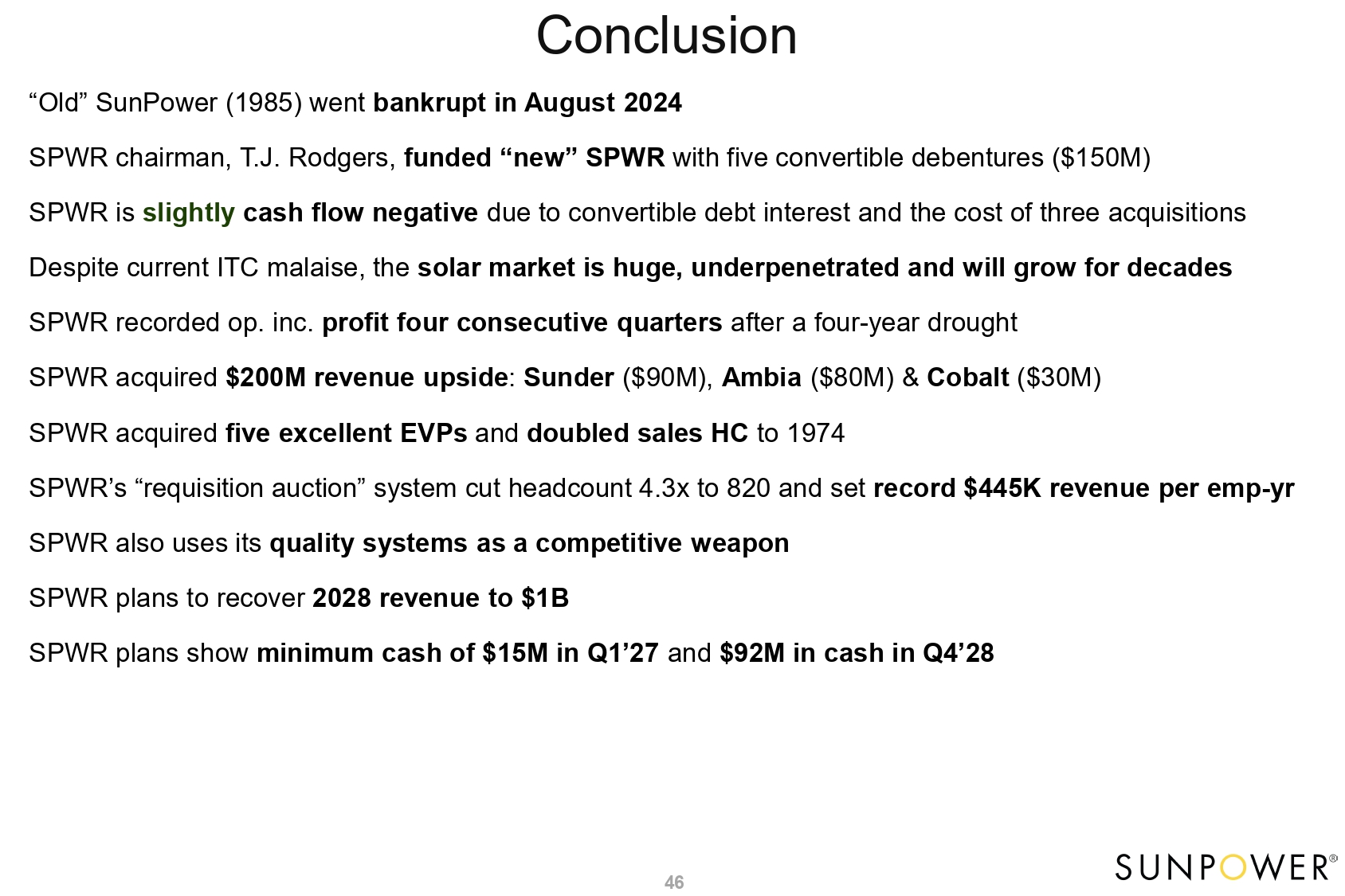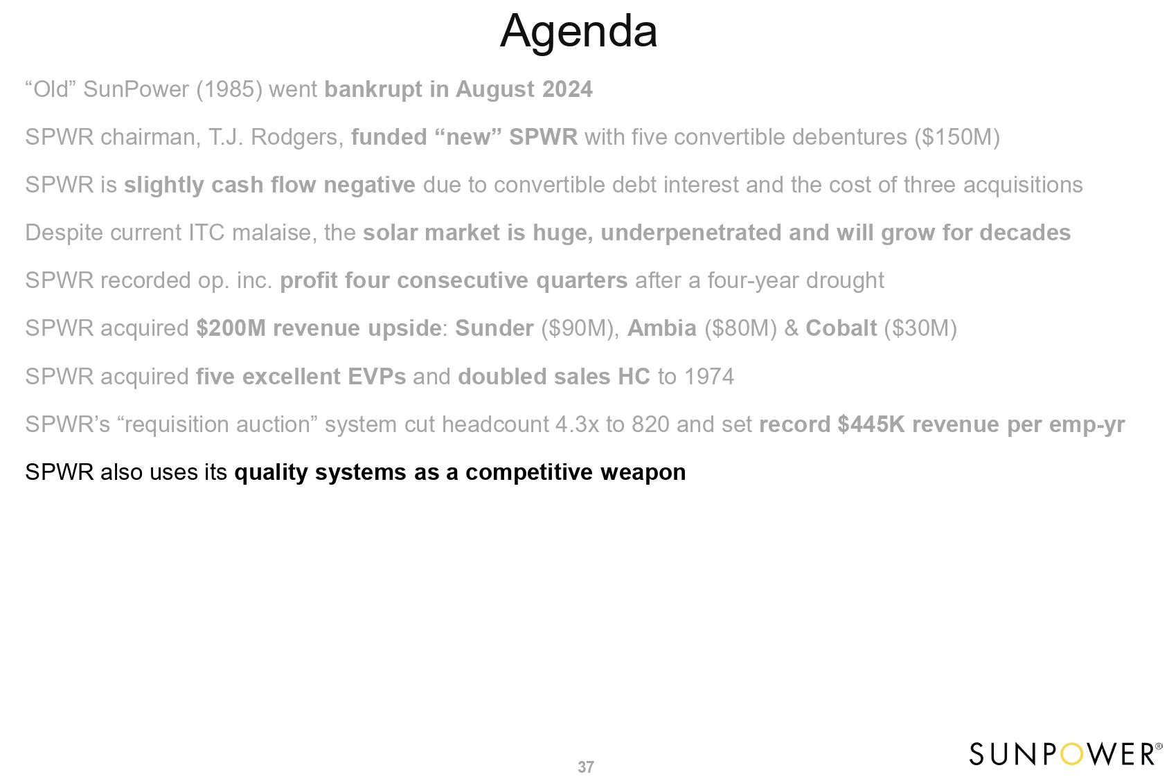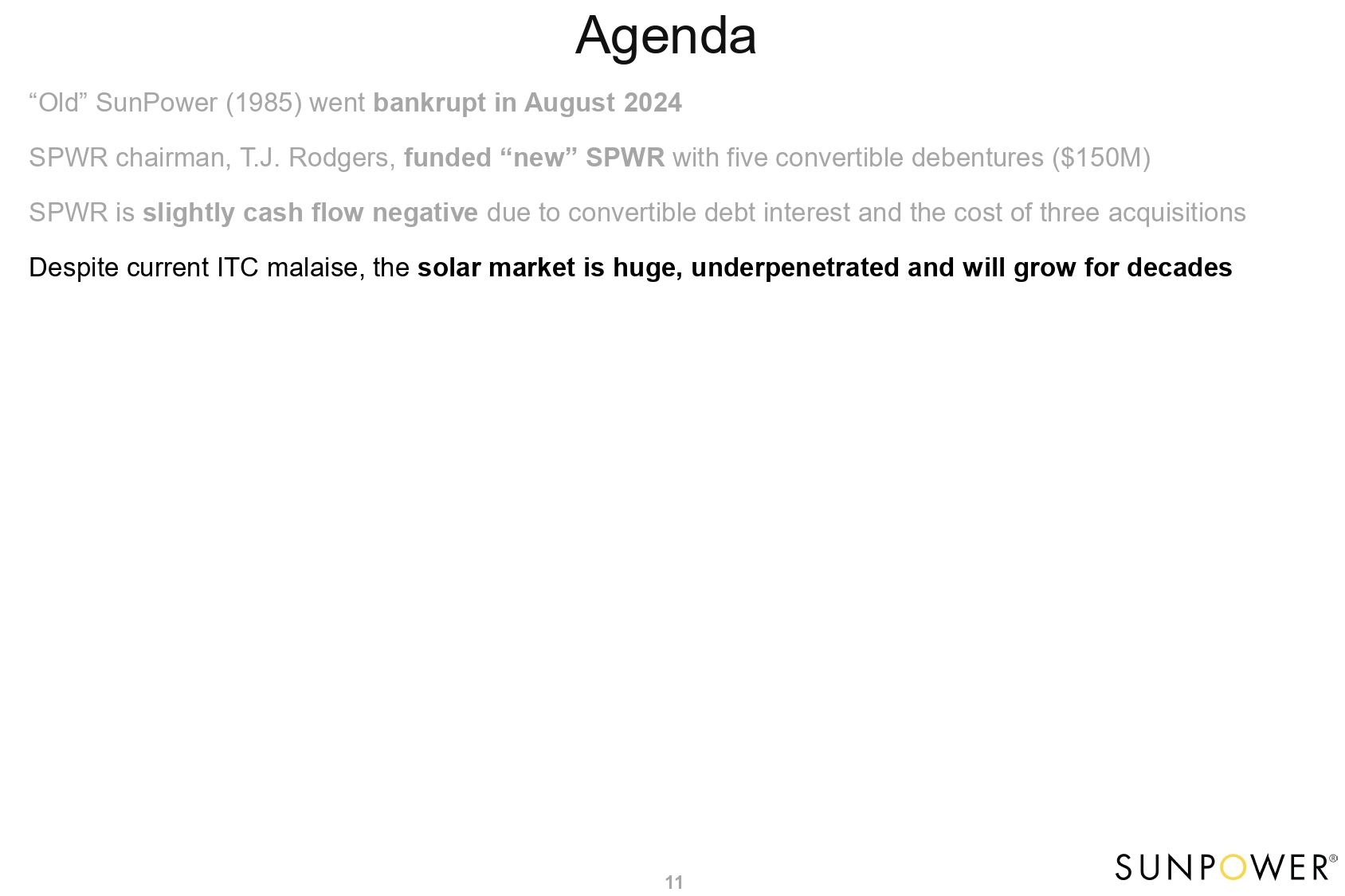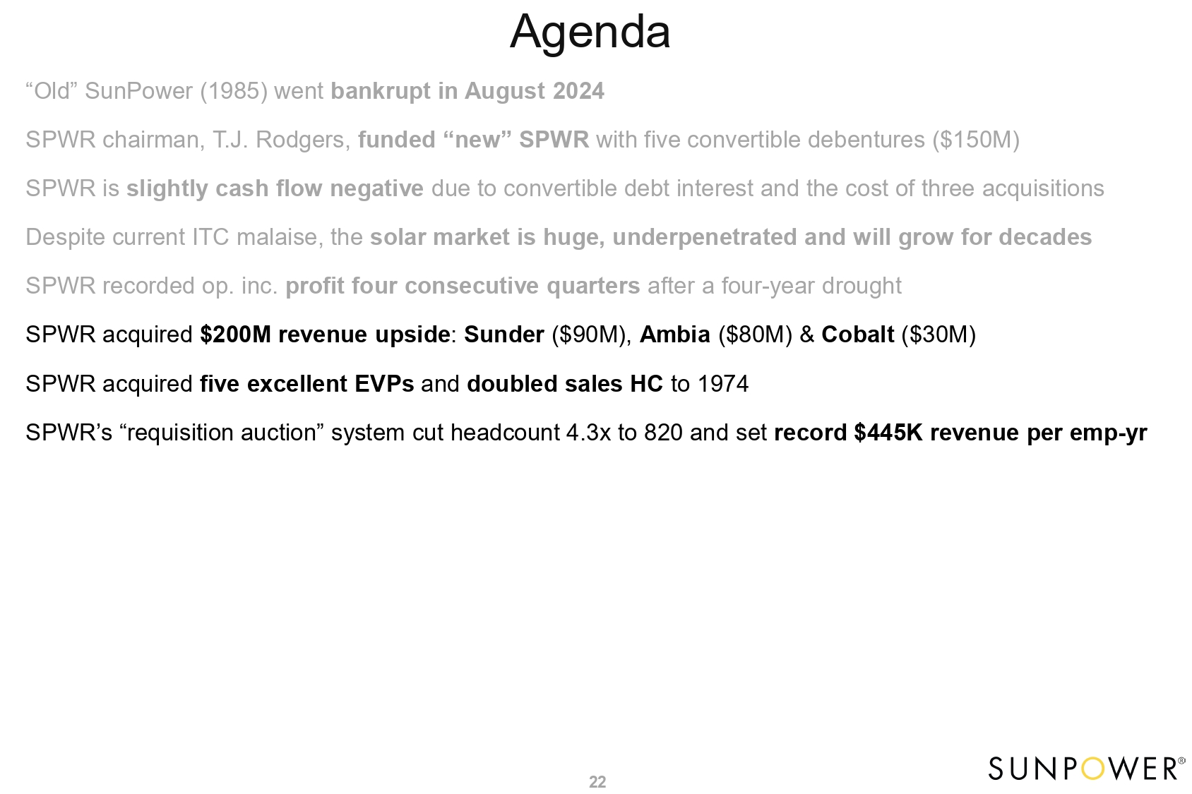Agenda 5 “Old” SunPower (1985) went bankrupt in August 2024 SPWR chairman, T.J. Rodgers, funded “new” SPWR with five convertible debentures ($150M) SPWR is slightly cash flow negative due to convertible debt interest and the cost of three acquisitions