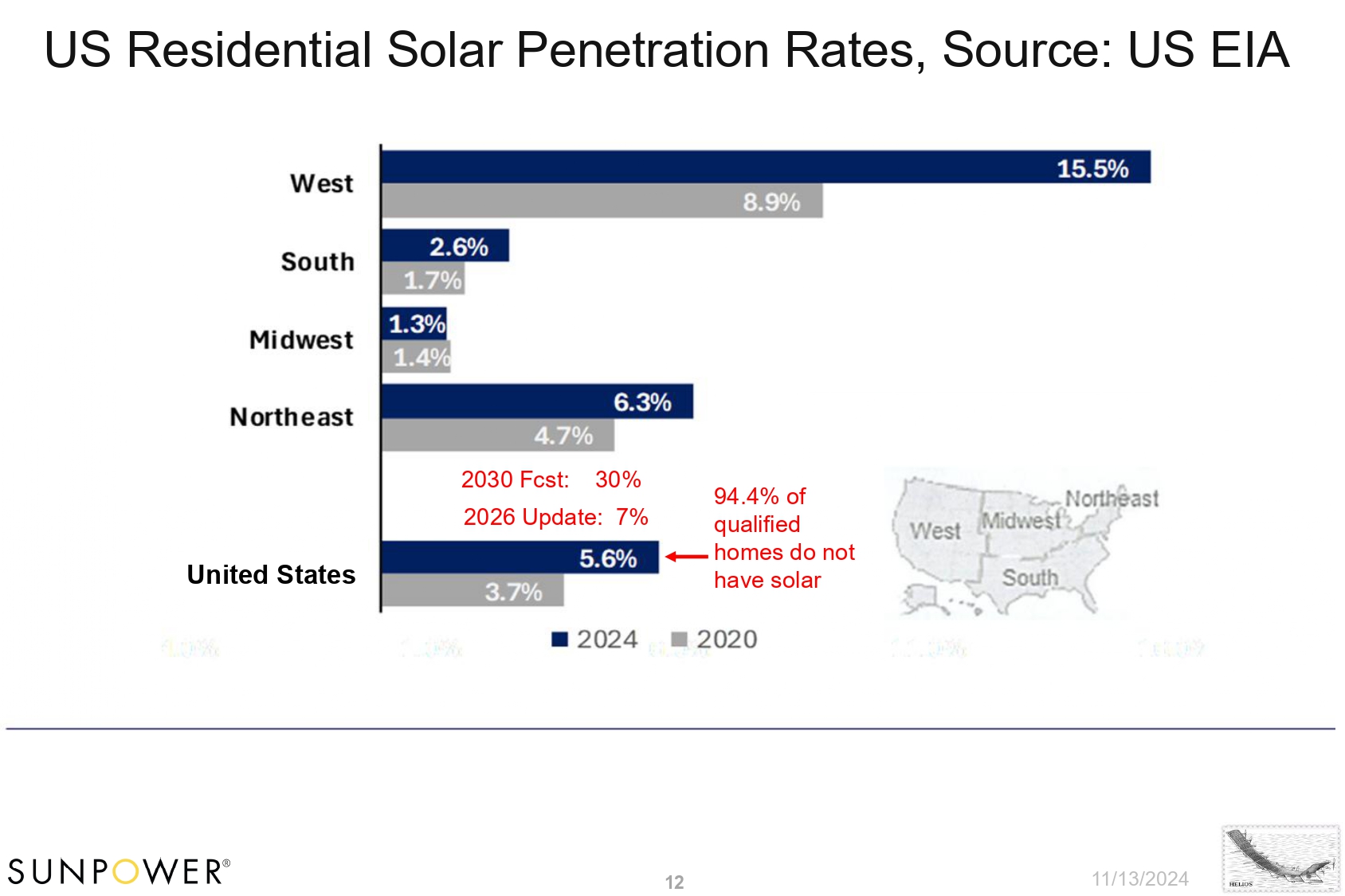 US Residential Solar Penetration Rates, Source: US EIA 94.4% of qualified homes do not have solar 2030 Fcst: 30% 2026 Update: 7% 11/13/2024 12 United States