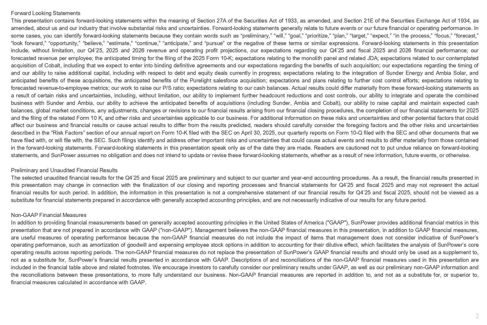 2 Forward Looking Statements This presentation contains forward - looking statements within the meaning of Section 27 A of the Securities Act of 1933 , as amended, and Section 21 E of the Securities Exchange Act of 1934 , as amended, about us and our industry that involve substantial risks and uncertainties . Forward - looking statements generally relate to future events or our future financial or operating performance . In some cases, you can identify forward - looking statements because they contain words such as “preliminary,” “will,” “goal,” “prioritize,” “plan,” “target,” “expect,” “in the process,” “focus,” “forecast,” “look forward,” “opportunity,” “believe,” “estimate,” “continue,” “anticipate,” and “pursue” or the negative of these terms or similar expressions . Forward - looking statements in this presentation include, without limitation, our Q 4 ’ 25 , 2025 and 2026 revenue and operating profit projections, our expectations regarding our Q 4 ’ 25 and fiscal 2025 and 2026 financial performance ; our forecasted revenue per employee ; the anticipated timing for the filing of the 2025 Form 10 - K ; expectations relating to the monolith panel and related JDA ; expectations related to our contemplated acquisition of Cobalt, including that we expect to enter into binding definitive agreements and our expectations regarding the benefits of such acquisition ; our expectations regarding the timing of and our ability to raise additional capital, including with respect to debt and equity deals currently in progress ; expectations relating to the integration of Sunder Energy and Ambia Solar, and anticipated benefits of these acquisitions, the anticipated benefits of the Purelight salesforce acquisition ; expectations and plans relating to further cost control efforts ; expectations relating to forecasted revenue - to - employee metrics ; our work to raise our P/S ratio ; expectations relating to our cash balances . Actual results could differ materially from these forward - looking statements as a result of certain risks and uncertainties, including, without limitation, our ability to implement further headcount reductions and cost controls, our ability to integrate and operate the combined business with Sunder and Ambia, our ability to achieve the anticipated benefits of acquisitions (including Sunder, Ambia and Cobalt), our ability to raise capital and maintain expected cash balances, global market conditions, any adjustments, changes or revisions to our financial results arising from our financial closing procedures, the completion of our financial statements for 2025 and the filing of the related Form 10 K, and other risks and uncertainties applicable to our business . For additional information on these risks and uncertainties and other potential factors that could affect our business and financial results or cause actual results to differ from the results predicted, readers should carefully consider the foregoing factors and the other risks and uncertainties described in the “Risk Factors” section of our annual report on Form 10 - K filed with the SEC on April 30 , 2025 , our quarterly reports on Form 10 - Q filed with the SEC and other documents that we have filed with, or will file with, the SEC . Such filings identify and address other important risks and uncertainties that could cause actual events and results to differ materially from those contained in the forward - looking statements . Forward - looking statements in this presentation speak only as of the date they are made . Readers are cautioned not to put undue reliance on forward - looking statements, and SunPower assumes no obligation and does not intend to update or revise these forward - looking statements, whether as a result of new information, future events, or otherwise . Preliminary and Unaudited Financial Results The selected unaudited financial results for the Q 4 ’ 25 and fiscal 2025 are preliminary and subject to our quarter and year - end accounting procedures . As a result, the financial results presented in this presentation may change in connection with the finalization of our closing and reporting processes and financial statements for Q 4 ’ 25 and fiscal 2025 and may not represent the actual financial results for such period . In addition, the information in this presentation is not a comprehensive statement of our financial results for Q 4 ’ 25 and fiscal 2025 , should not be viewed as a substitute for financial statements prepared in accordance with generally accepted accounting principles, and are not necessarily indicative of our results for any future period . Non - GAAP Financial Measures In addition to providing financial measurements based on generally accepted accounting principles in the United States of America ("GAAP"), SunPower provides additional financial metrics in this presentation that are not prepared in accordance with GAAP ("non - GAAP") . Management believes the non - GAAP financial measures in this presentation, in addition to GAAP financial measures, are useful measures of operating performance because the non - GAAP financial measures do not include the impact of items that management does not consider indicative of SunPower’s operating performance, such as amortization of goodwill and expensing employee stock options in addition to accounting for their dilutive effect, which facilitates the analysis of SunPower’s core operating results across reporting periods . The non - GAAP financial measures do not replace the presentation of SunPower’s GAAP financial results and should only be used as a supplement to, not as a substitute for, SunPower’s financial results presented in accordance with GAAP . Descriptions of and reconciliations of the non - GAAP financial measures used in this presentation are included in the financial table above and related footnotes . We encourage investors to carefully