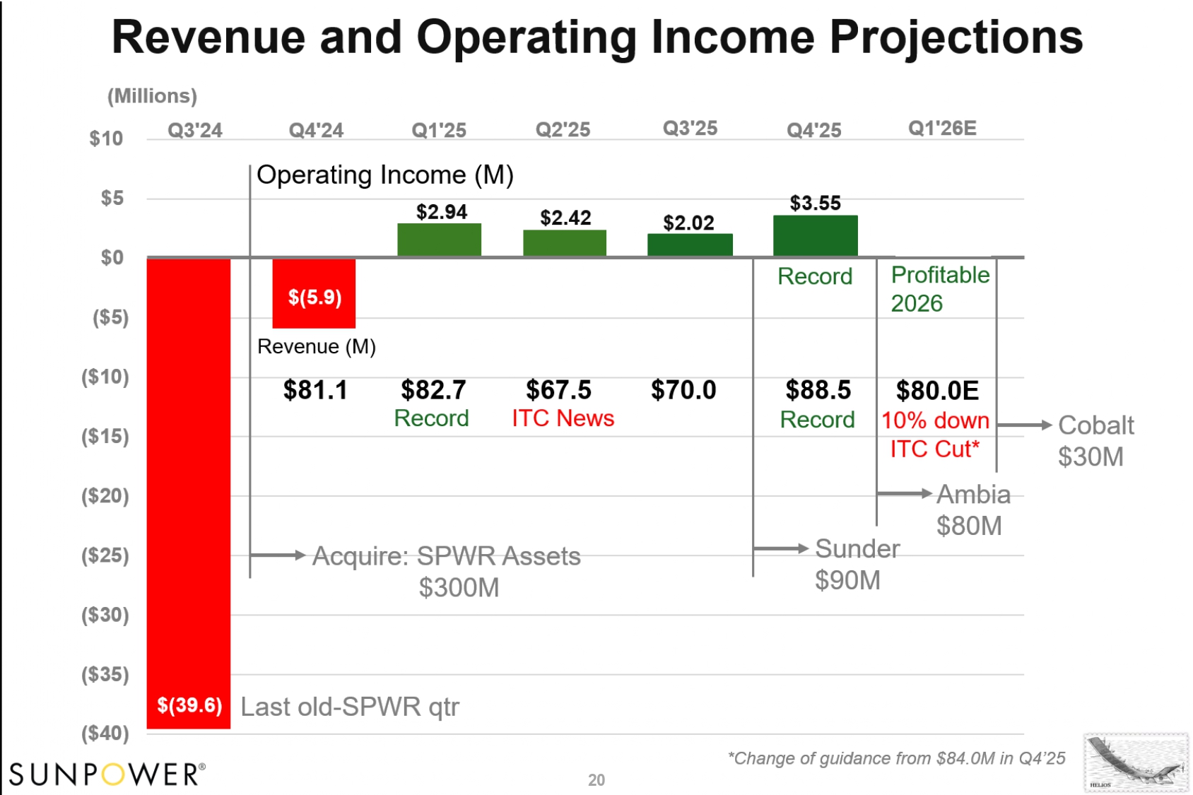 $2.42 $67.5 ITC News $2.02 $70.0 Cobalt $30M $3.55 Record $88.5 Record Sunder $90M $2.94 $82.7 Record $2.00 E Profitable 2026 $80.0E 10% down ITC Cut* Ambia $80M Revenue and Operating Income Projections (Millions) $10 Q3'24 Q4'24 Q1'25 Q2'25 Q3'25 Q4'25 Q1'26E Operating Income (M) $5 $0 $(5.9) ($5) Revenue (M) ($10) $81.1 ($15) ($20) ($25) Acquire: SPWR Assets $300M ($30) ($35) $(39.6) Last old - SPWR qtr ($40) *Change of guidance from $84.0M in Q4’25 20 20
