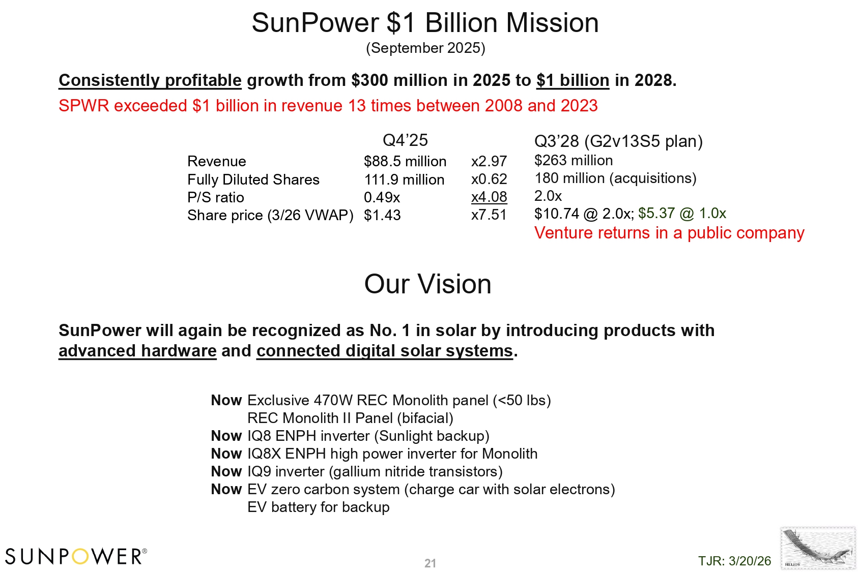 21 SunPower $1 Billion Mission (September 2025) Consistently profitable growth from $300 million in 2025 to $1 billion in 2028. SPWR exceeded $1 billion in revenue 13 times between 2008 and 2023 Our Vision SunPower will again be recognized as No. 1 in solar by introducing products with advanced hardware and connected digital solar systems . Now Exclusive 470W REC Monolith panel (<50 lbs) REC Monolith II Panel (bifacial) Now IQ8 ENPH inverter (Sunlight backup) Now IQ8X ENPH high power inverter for Monolith Now IQ9 inverter (gallium nitride transistors) Now EV zero carbon system (charge car with solar electrons) EV battery for backup Q4’25 $88.5 million 111.9 million 0.49x $1.43 Revenue Fully Diluted Shares P/S ratio Share price (3/26 VWAP) Q3’28 (G2v13S5 plan) $263 million 180 million (acquisitions) 2.0x $10.74 @ 2.0x; $5.37 @ 1.0x Venture returns in a public company x 2 . 97 x 0 . 62 x 4 . 08 x 7 . 51 TJR: 3/20/26