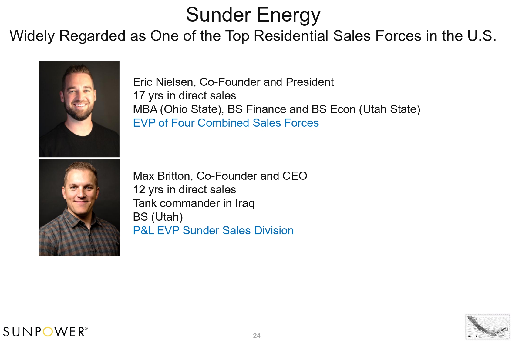 Sunder Energy Widely Regarded as One of the Top Residential Sales Forces in the U.S. Eric Nielsen, Co - Founder and President 17 yrs in direct sales MBA (Ohio State), BS Finance and BS Econ (Utah State) EVP of Four Combined Sales Forces Max Britton, Co - Founder and CEO 12 yrs in direct sales Tank commander in Iraq BS (Utah) P&L EVP Sunder Sales Division 24 24