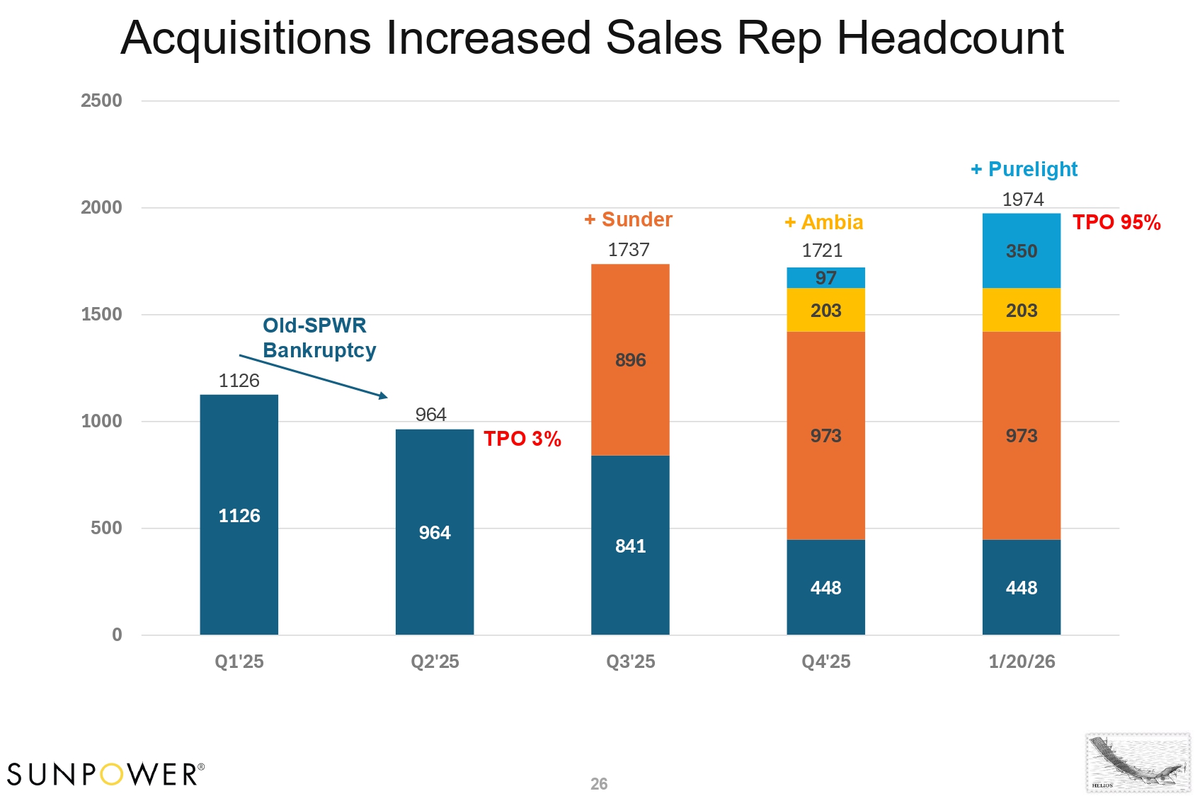 Acquisitions Increased Sales Rep Headcount 1126 G64 841 448 448 8G6 G73 G73 203 203 G7 350 1126 964 + Sunder 1737 + Ambia 1721 + Purelight 1974 0 500 1000 1500 2000 2500 Q1'25 Q2'25 Q3'25 Q4'25 1/20/26 SunPower Sunder Ambia Purelight Old - SPWR Bankruptcy TPO 3% 26 TPO 95%