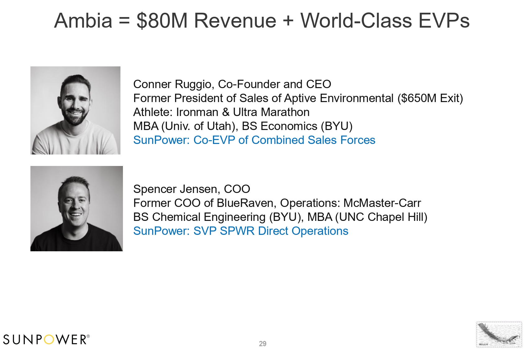 Ambia = $80M Revenue + World - Class EVPs Conner Ruggio, Co - Founder and CEO Former President of Sales of Aptive Environmental ($650M Exit) Athlete: Ironman & Ultra Marathon MBA (Univ. of Utah), BS Economics (BYU) SunPower: Co - EVP of Combined Sales Forces Spencer Jensen, COO Former COO of BlueRaven, Operations: McMaster - Carr BS Chemical Engineering (BYU), MBA (UNC Chapel Hill) SunPower: SVP SPWR Direct Operations 29