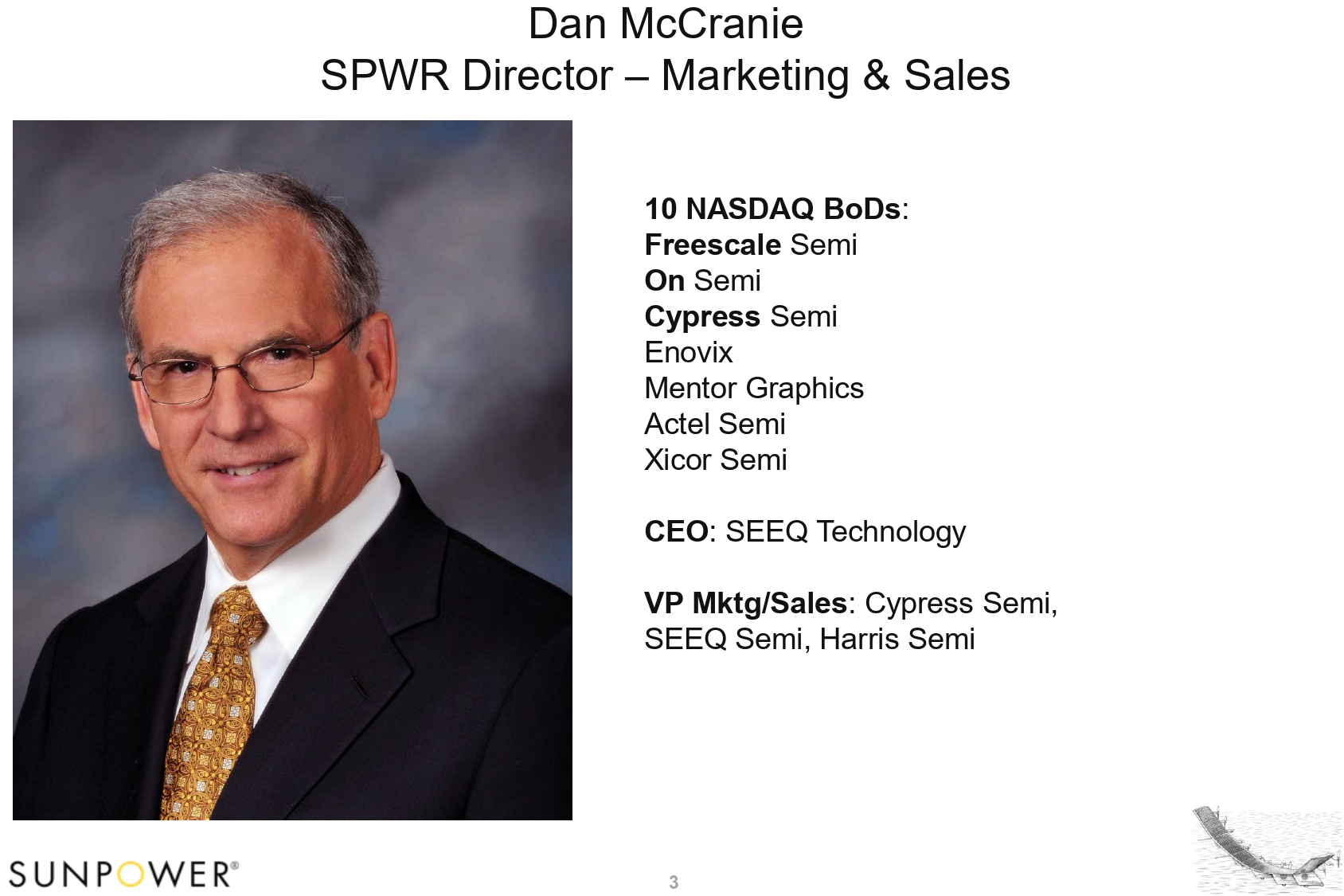 Spec Template 12645 / A Dan McCranie SPWR Director – Marketing & Sales 10 NASDAQ BoDs : Freescale Semi On Semi Cypress Semi Enovix Mentor Graphics Actel Semi Xicor Semi CEO : SEEQ Technology VP Mktg/Sales : Cypress Semi, SEEQ Semi, Harris Semi 3
