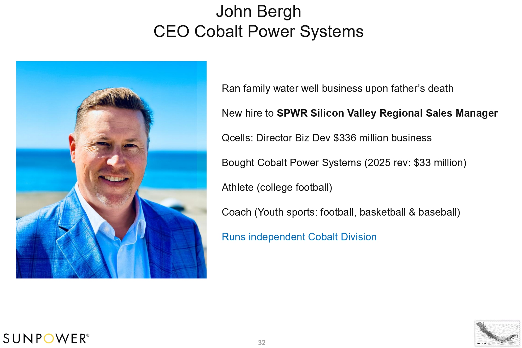 32 John Bergh CEO Cobalt Power Systems Ran family water well business upon father’s death New hire to SPWR Silicon Valley Regional Sales Manager Qcells: Director Biz Dev $336 million business Bought Cobalt Power Systems (2025 rev: $33 million) Athlete (college football) Coach (Youth sports: football, basketball & baseball) Runs independent Cobalt Division
