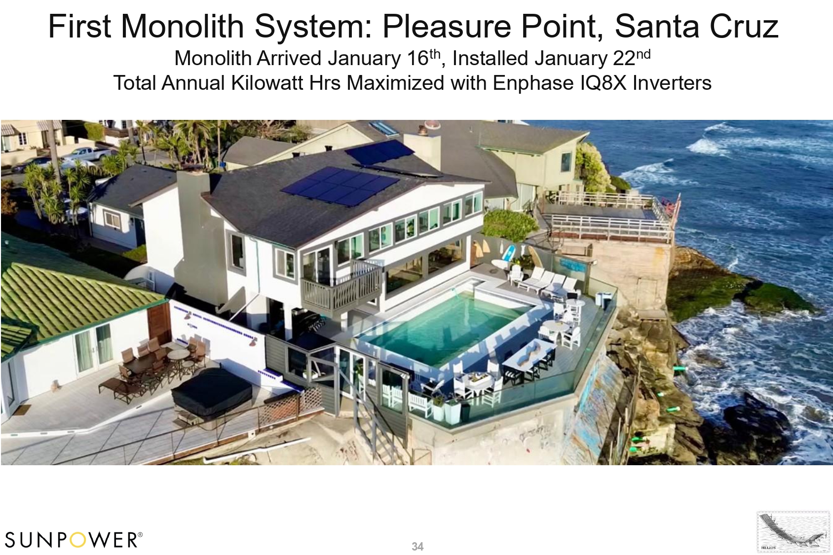 First Monolith System: Pleasure Point, Santa Cruz 34 Monolith Arrived January 16 th , Installed January 22 nd Total Annual Kilowatt Hrs Maximized with Enphase IQ8X Inverters