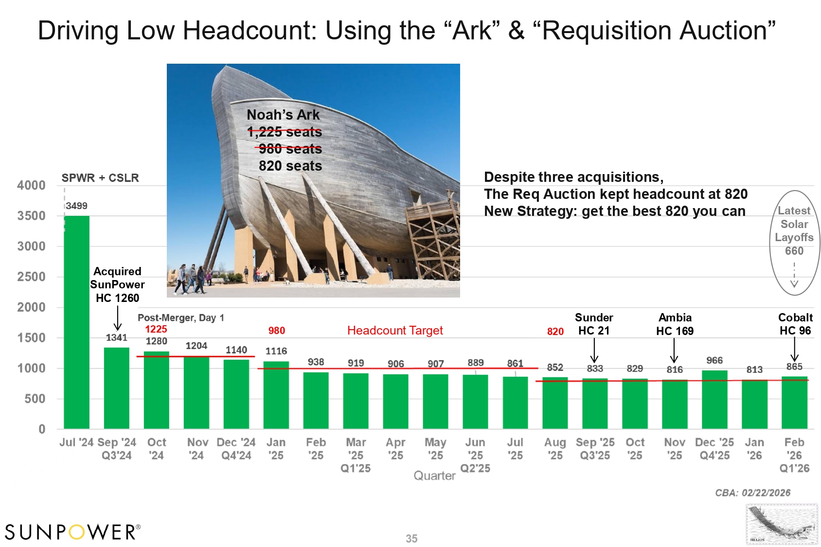 Driving Low Headcount: Using the “Ark” & “Requisition Auction” Headcount Target Sunder HC 21 Ambia HC 169 Cobalt HC 96 1225 980 820 Latest Solar Layoffs 660 Noah’s Ark 1,225 seats 980 seats 820 seats Despite three acquisitions, The Req Auction kept headcount at 820 New Strategy: get the best 820 you can Acquired SunPower HC 1260 35 35