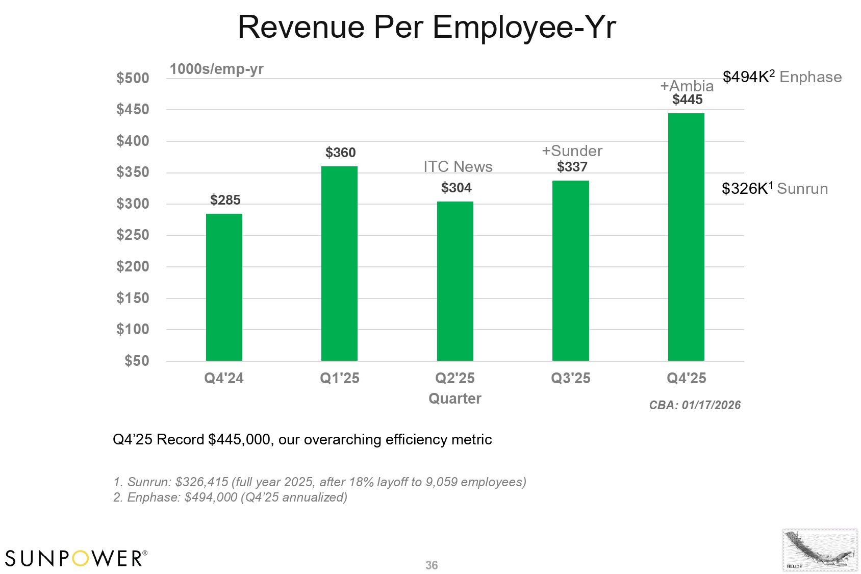 Revenue Per Employee - Yr +Sunder ITC News 36 Q4’25 Record $445,000, our overarching efficiency metric 1. Sunrun: $326,415 (full year 2025, after 18% layoff to 9,059 employees) 2. Enphase: $494,000 (Q4’25 annualized) $326K 1 Sunrun +Ambia $494K 2 Enphase
