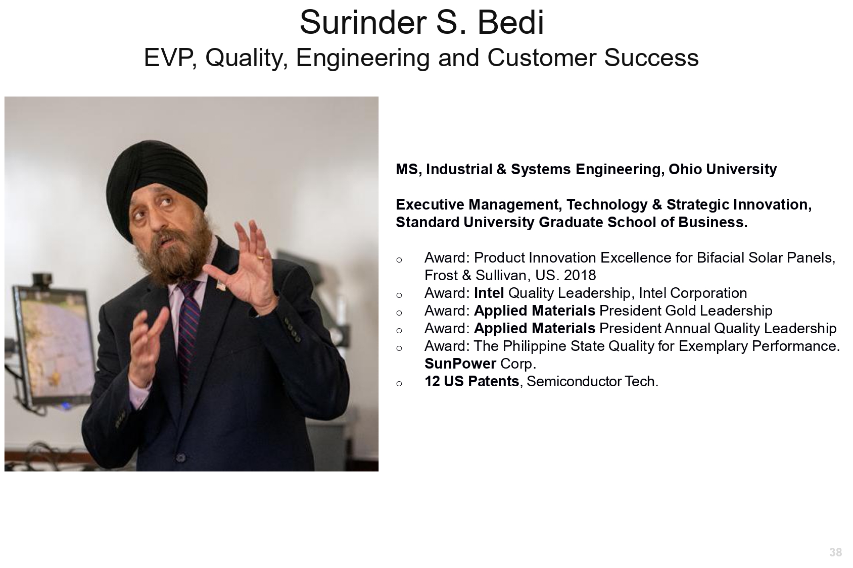 Surinder S. Bedi EVP, Quality, Engineering and Customer Success 38 MS, Industrial & Systems Engineering, Ohio University Executive Management, Technology & Strategic Innovation, Standard University Graduate School of Business. o Award: Product Innovation Excellence for Bifacial Solar Panels, Frost & Sullivan, US. 2018 o Award: Intel Quality Leadership, Intel Corporation o Award: Applied Materials President Gold Leadership o Award: Applied Materials President Annual Quality Leadership o Award: The Philippine State Quality for Exemplary Performance. SunPower Corp. o 12 US Patents , Semiconductor Tech.