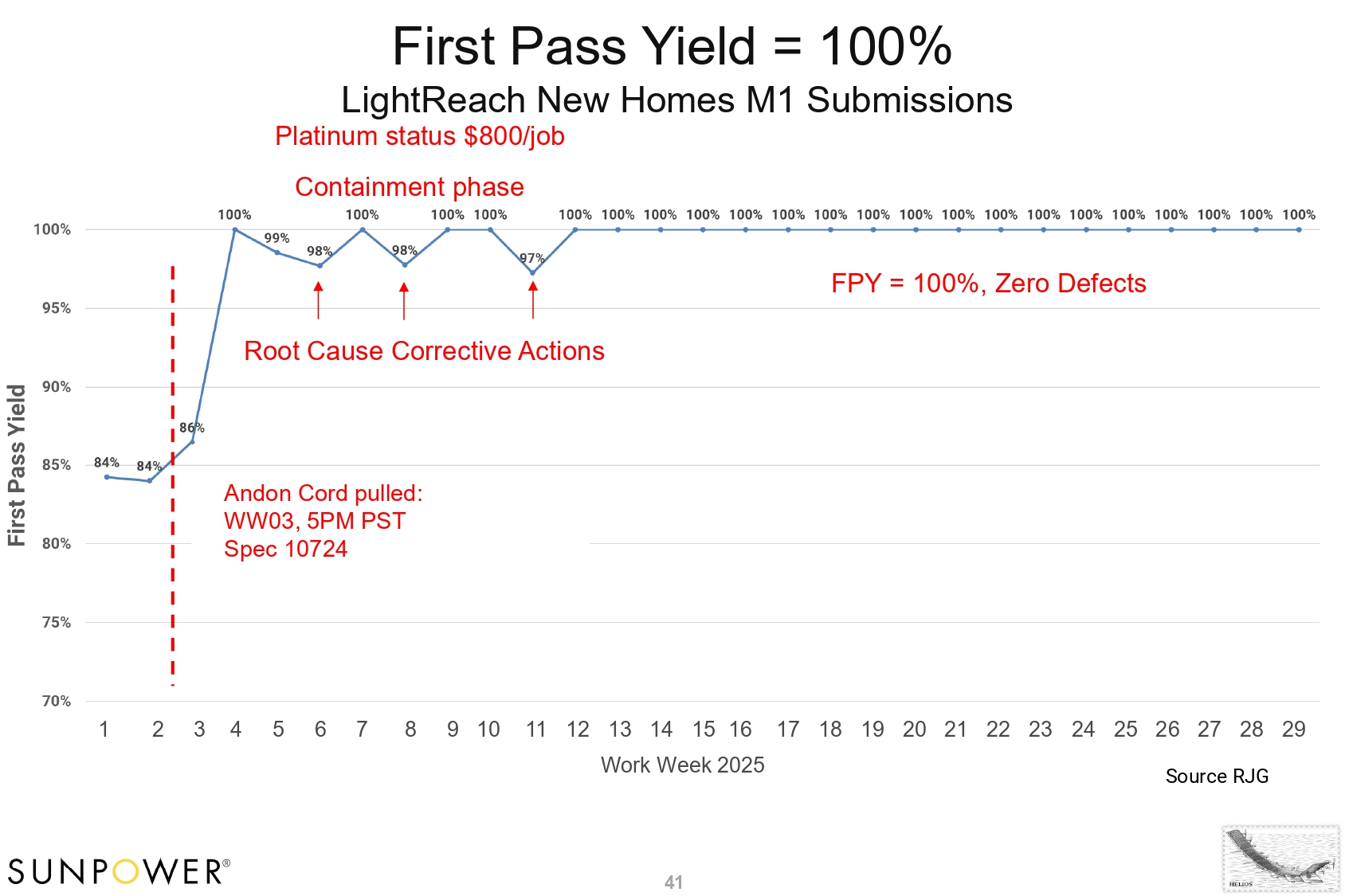 First Pass Yield = 100% Source RJG Andon Cord pulled: WW03, 5PM PST Spec 10724 1 2 3 4 5 6 7 8 9 10 11 12 13 14 15 16 17 18 19 20 21 22 23 24 25 26 27 28 29 Work Week 2025 41 LightReach New Homes M1 Submissions Platinum status $800/job Containment phase FPY = 100%, Zero Defects Root Cause Corrective Actions