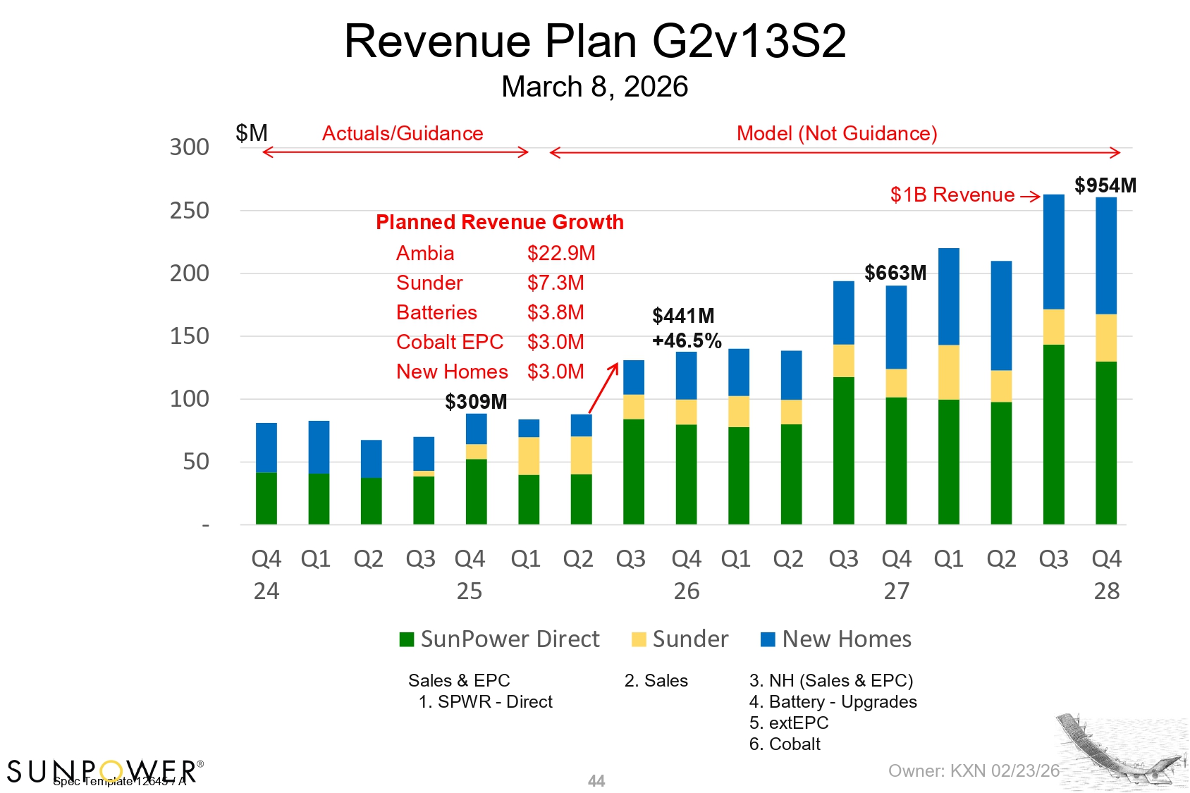 Spec Template 12645 / A 44 50 - 100 150 200 250 300 Q3 Q4 Q1 Q2 Q3 26 Q4 Q1 Q2 Q3 Q4 27 28 Q4 Q1 Q2 Q3 Q4 Q1 Q2 24 25 SunPower Direct Sales & EPC 1. SPWR - Direct Sunder 2. Sales New Homes 3. NH (Sales & EPC) 4. Battery - Upgrades 5. extEPC 6. Cobalt Owner: KXN 02/23/26 Revenue Plan G2v13S2 $M $441M +46.5% $663M $954M March 8, 2026 Actuals/Guidance Model (Not Guidance) $1B Revenue Sunder Batteries Cobalt EPC $7.3M $3.8M $3.0M New Homes $309M $3.0M Planned Revenue Growth Ambia $22.9M