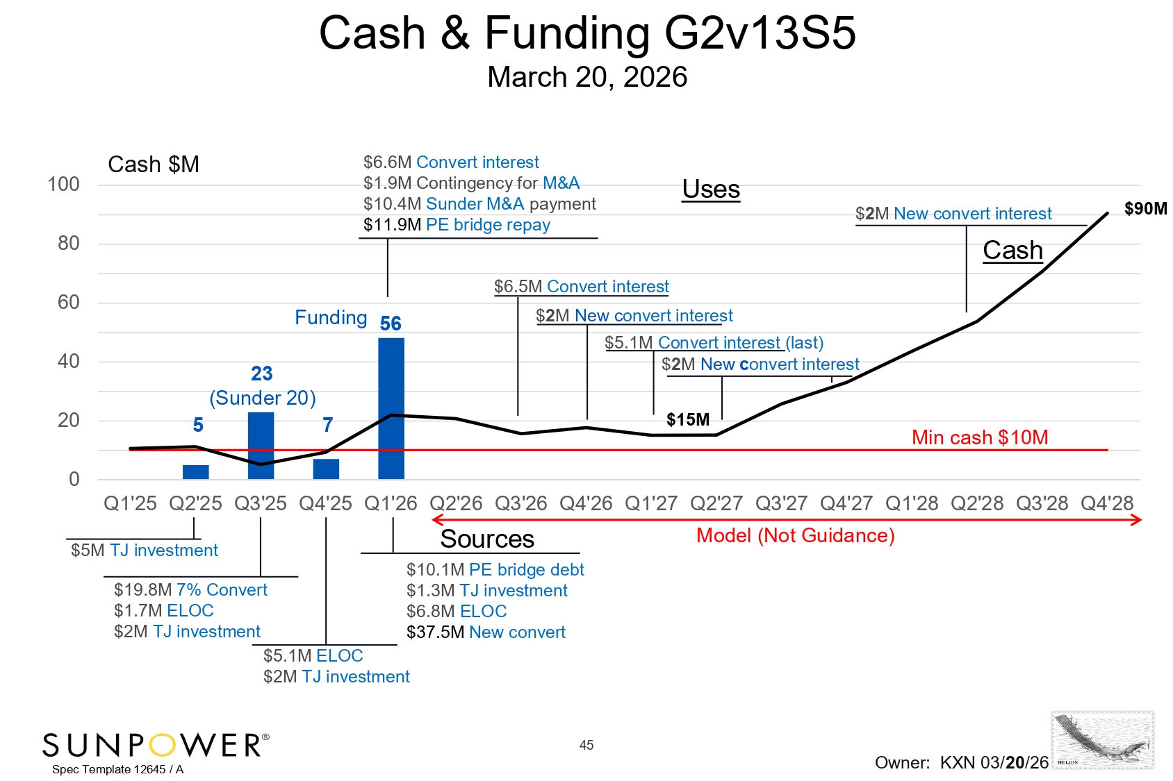 Spec Template 12645 / A 45 Sunder Payment Capital Raised 0 Q1'25 Q2'25 Q3'25 Q4'25 Q1'26 Q2'26 Q3'26 Q4'26 Q1'27 Q2'27 Q3'27 Q4'27 Q1'28 Q2'28 Q3'28 Q4'28 20 40 60 80 100 Cash & Funding G2v13S5 March 20, 2026 Owner: KXN 03/ 20 /26 Cash $M Min cash $10M $10.1M PE bridge debt $1.3M TJ investment $6.8M ELOC $37.5M New convert $5.1M ELOC $2M TJ investment $5M TJ investment $19.8M 7% Convert $1.7M ELOC $2M TJ investment 5 23 (Sunder 20) 7 $6.6M Convert interest $1.9M Contingency for M&A $10.4M Sunder M&A payment $11.9M PE bridge repay $6.5M Convert interest $5.1M Convert interest (last) $ 2 M New c onvert interest $ 2 M New c onvert interest $ 2 M New convert interest Funding 56 Sources Uses Model (Not Guidance) Cash $90M $15M