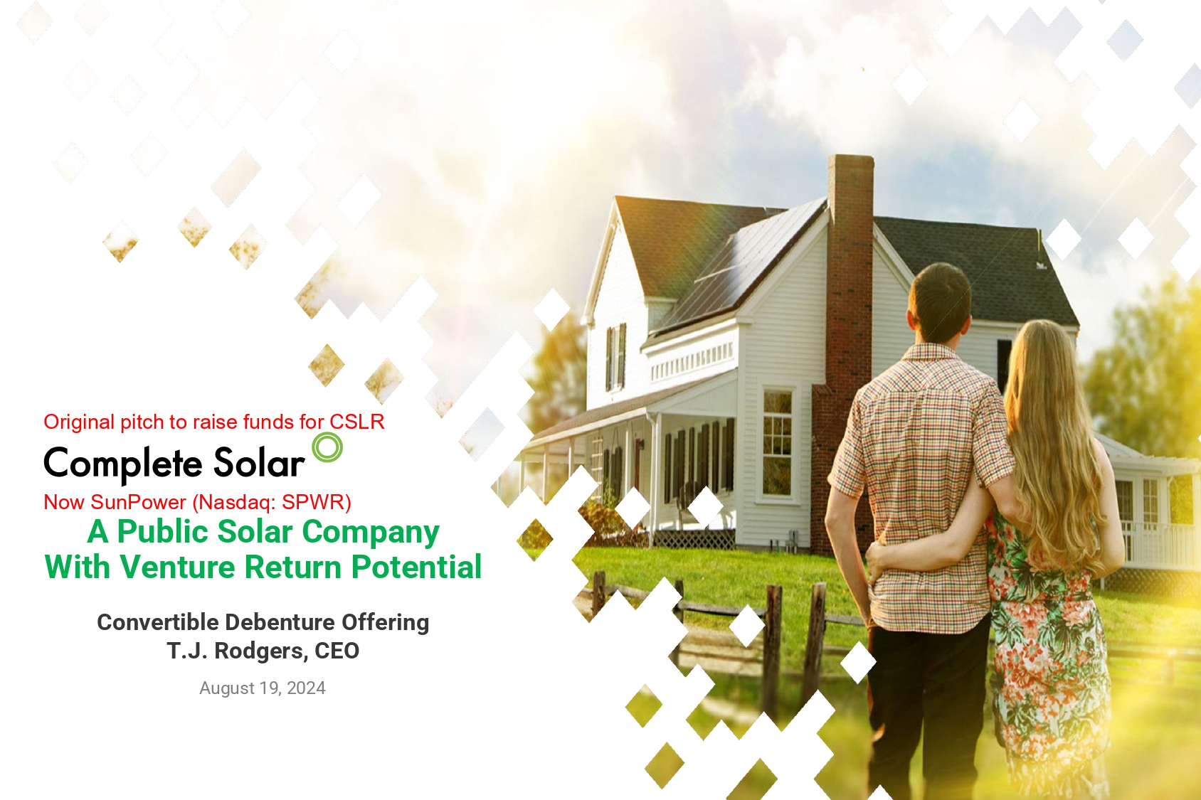 ©2024 Complete Solaria Owner: T.J. Rodgers 6 Original pitch to raise funds for CSLR Now SunPower (Nasdaq: SPWR) A Public Solar Company With Venture Return Potential Convertible Debenture Offering T.J. Rodgers, CEO August 19, 2024