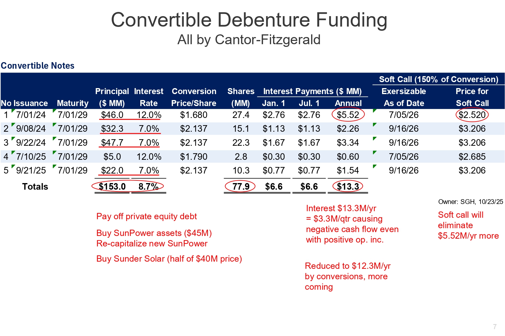 Convertible Debenture Funding All by Cantor - Fitzgerald Convertible Notes Maturity Conversion Price/Share Shares (MM) Exersizable As of Date Price for Soft Call 7/01/29 Principal Interest ($ MM) Rate $46.0 12.0% $1.680 7/05/26 $2.520 7/01/29 $32.3 7.0% $2.137 9/16/26 $3.206 7/01/29 $2.137 9/16/26 $3.206 No Issuance 1 7/01/24 2 9/08/24 3 9/22/24 4 7/10/25 7/01/29 $47.7 7.0% $5.0 12.0% $1.790 7/05/26 $2.685 $3.206 9/16/26 $1.54 $0.77 $0.77 10.3 $2.137 $22.0 7.0% 7/01/29 5 9/21/25 Totals $6.6 Owner: SGH, 10/23/25 Soft call will eliminate $5.52M/yr more Soft Call (150% of Conversion) Interest Payments ($ MM) Jan. 1 Jul. 1 Annual 27.4 $2.76 $2.76 $5.52 15.1 $1.13 $1.13 $2.26 22.3 $1.67 $1.67 $3.34 2.8 $0.30 $0.30 $0.60 $153.0 8.7% 77.9 Pay off private equity debt Buy SunPower assets ($45M) Re - capitalize new SunPower Buy Sunder Solar (half of $40M price) $6.6 $13.3 Interest $13.3M/yr = $3.3M/qtr causing negative cash flow even with positive op. inc. 7 Reduced to $12.3M/yr by conversions, more coming