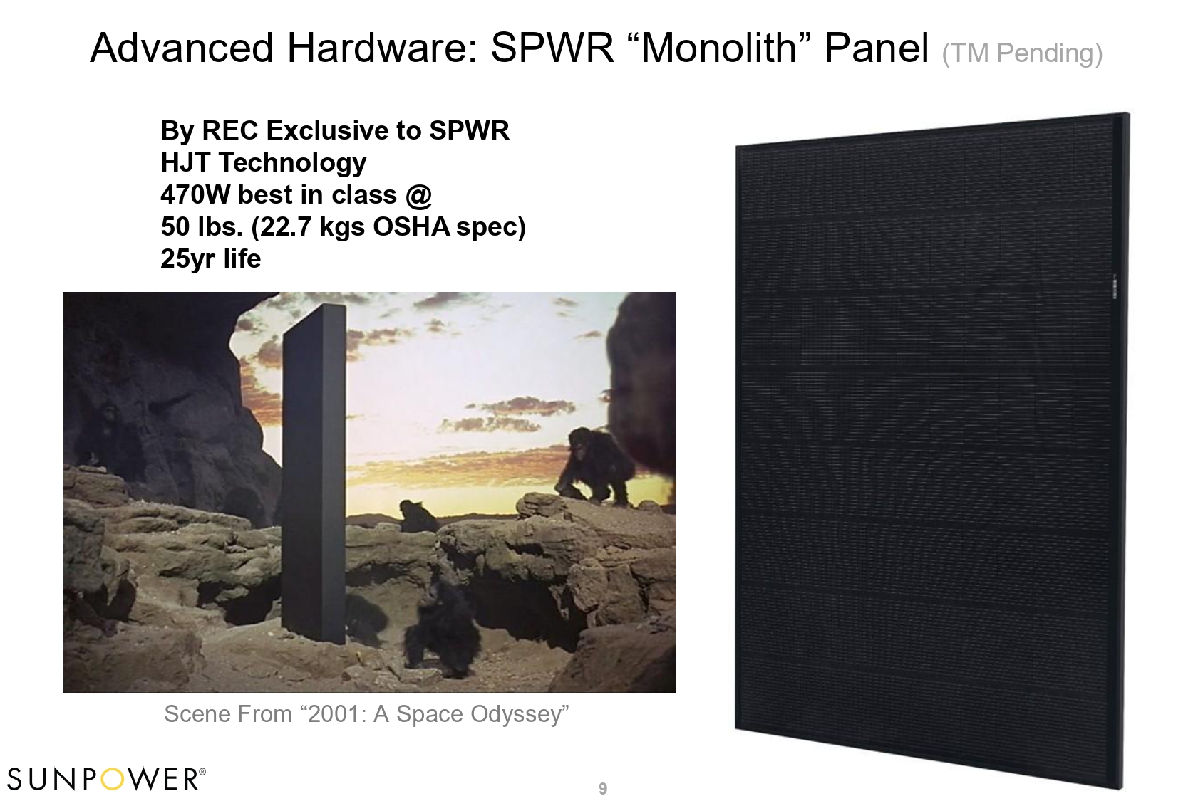 Advanced Hardware: SPWR “Monolith” Panel (TM Pending) By REC Exclusive to SPWR HJT Technology 470W best in class @ 50 lbs. (22.7 kgs OSHA spec) 25yr life Scene From “2001: A Space Odyssey” 9