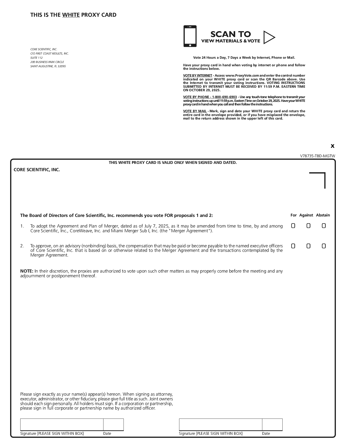 Two Seas Capital LP, Two Seas Capital GP LLC and Sina Toussi (collectively, “Two Seas”), have filed a definitive proxy statement in connection with the Special Meeting. We recommend that Core Scientific stockholders disregard any proxy card sent to them by or on behalf of any person other than Core Scientific, including any gold proxy card and solicitation materials that may be sent by or on behalf of Two Seas, which is soliciting proxies to vote against the Merger Agreement Proposal and Advisory Compensation Proposal. If you have submitted such a proxy card (including a gold proxy card), we ask that you subsequently recast your vote as instructed on the WHITE proxy card mailed to you by Core Scientific, which will revoke any earlier dated proxy card that you submitted. Only the last validly executed proxy that you submit will be counted and such proxy will be counted only if it has been received by 11:59 p.m., Eastern Time on October 29, 2025.