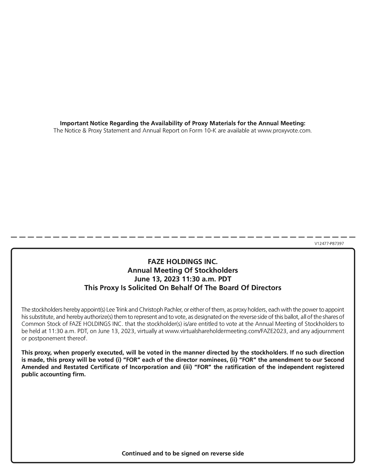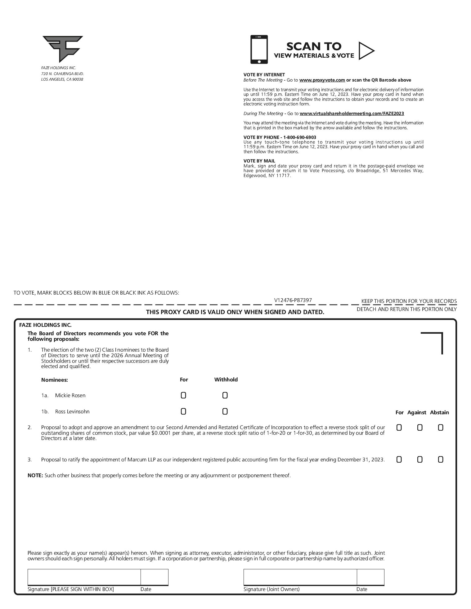 Pursuant to the Warrant Agreement, dated as of February 18, 2021 (the “Warrant Agreement”), by and between FaZe and Continental Stock Transfer & Trust Company, on the effective date of the Reverse Stock Split, (i) the number of shares of common stock issuable upon exercise of each Warrant shall be decreased in proportion to the decrease in outstanding shares of common stock and (ii) the warrant price shall be proportionally increased. Notwithstanding the foregoing, the Warrant Agreement provides that the Company may not issue fractional shares upon the exercise of Warrants, and if the holder of any Warrant would be entitled to receive fractional shares upon the exercise thereof, the Company shall round down the number of shares to be issued upon such exercise to the nearest whole number.
