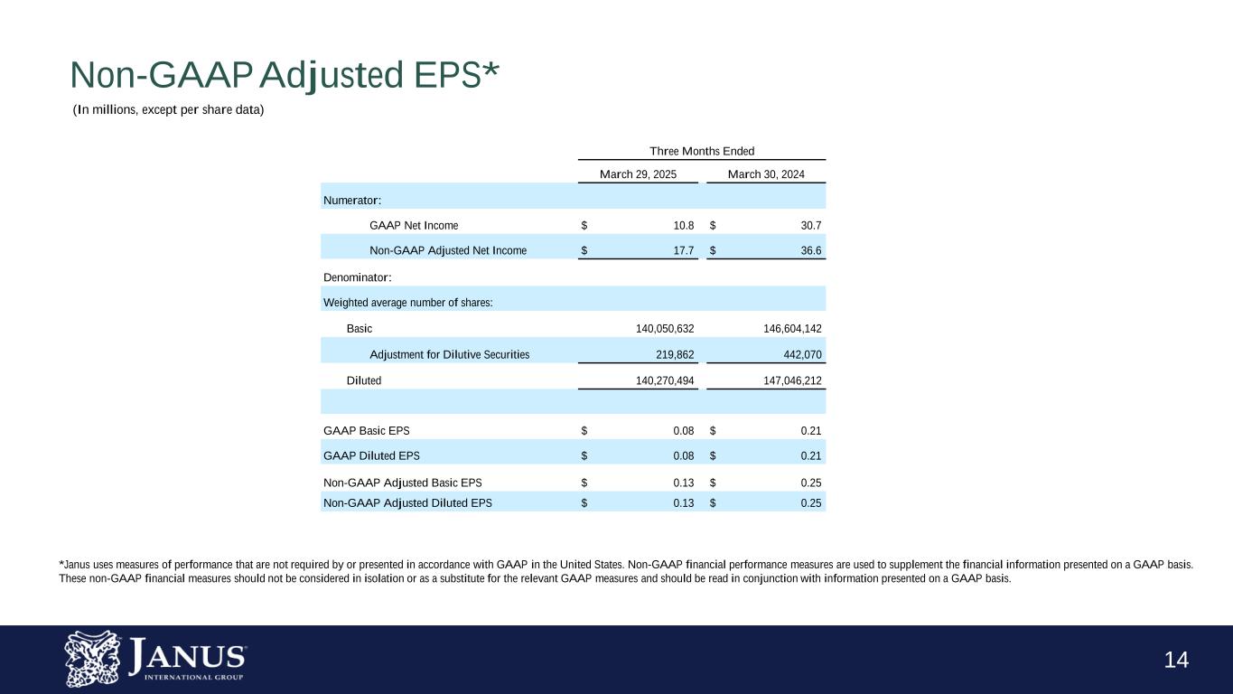 13 Adjusted Net Income Reconciliation* Three Months Ended March 29, 2025 March 30, 2024 Net income $ 10.8 $ 30.7 Net Income Adjustments(1) 1.6 0.5 Amortization 8.3 7.4 Tax Effect on Net Income Adjustments(2) (3.0) (2.0) Non-GAAP adjusted net income* $ 17.7 $ 36.6 1. Net income adjustments for the three months ended March 29, 2025 include $0.4 restructuring charges, $0.9 acquisition expenses, and $0.3 of other. Net Income Adjustments for the three months ended March 30, 2024 include $0.4 restructuring charges and $0.1 acquisition expenses. Refer to the adjusted EBITDA table above for further details. 2. The effective tax rate of 29.9% was used for the three months ended March 29, 2025. The effective tax rate of 25.5% was used for the three months ended March 30, 2024. . *Janus uses measures of performance that are not required by or presented in accordance with GAAP in the United States. Non-GAAP financial performance measures are used to supplement the financial information presented on a GAAP basis. These non-GAAP financial measures should not be considered in isolation or as a substitute for the relevant GAAP measures and should be read in conjunction with information presented on a GAAP basis. (In millions)