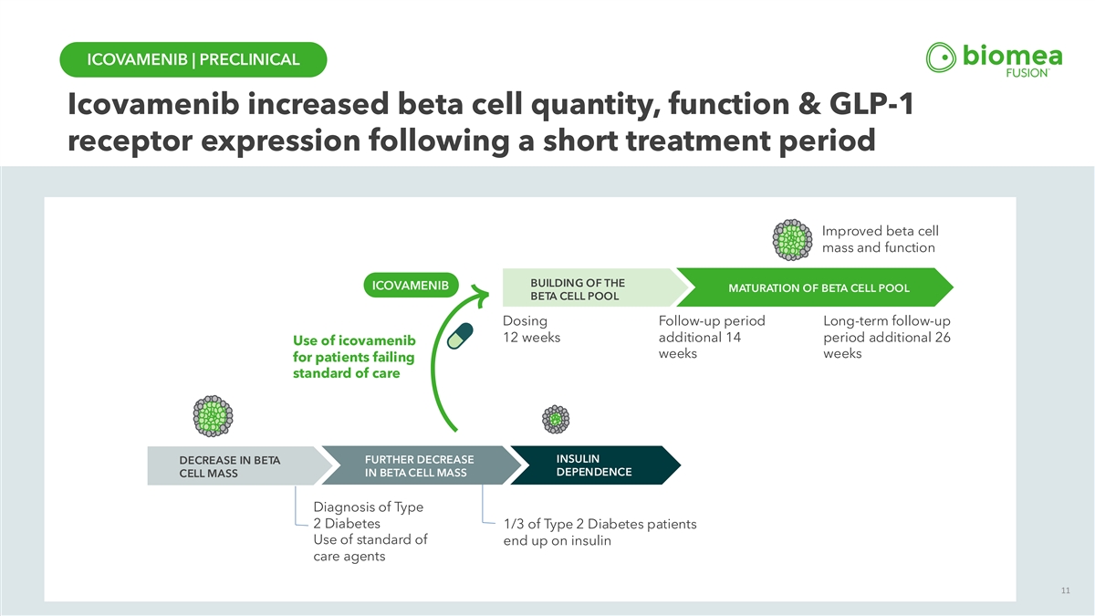 ICOVAMENIB | PRECLINICAL Icovamenib’s mechanism of action IMPROVED BETA CELL MASS & FUNCTION Induction of beta Increase in insulin cell proliferation Decrease in blood glucose Pancreatic islet Icovamenib promotes selective and partial reduction in menin levels Lowering menin levels releases the break on beta cell proliferation and GLP-1 and IMPROVED INCRETIN EFFECTS GLP-1 receptor expression Synergistic with GLP-1 based therapies Improved beta cell function Increased expression of Decrease in blood glucose • GLP-1 • GLP-1 receptor Potential for weight loss Potential for lean mass/muscle preservation 10