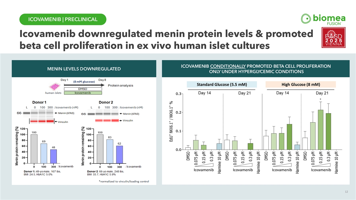 ICOVAMENIB | PRECLINICAL ICOVAMENIB | PRECLINICAL Icovamenib downregulated menin protein levels & promoted beta cell proliferation in ex vivo human islet cultures ICOVAMENIB CONDITIONALLY PROMOTED BETA CELL PROLIFERATION MENIN LEVELS DOWNREGULATED ONLY UNDER HYPERGLYCEMIC CONDITIONS Standard Glucose (5.5 mM) High Glucose (8 mM) 12