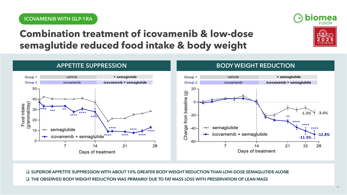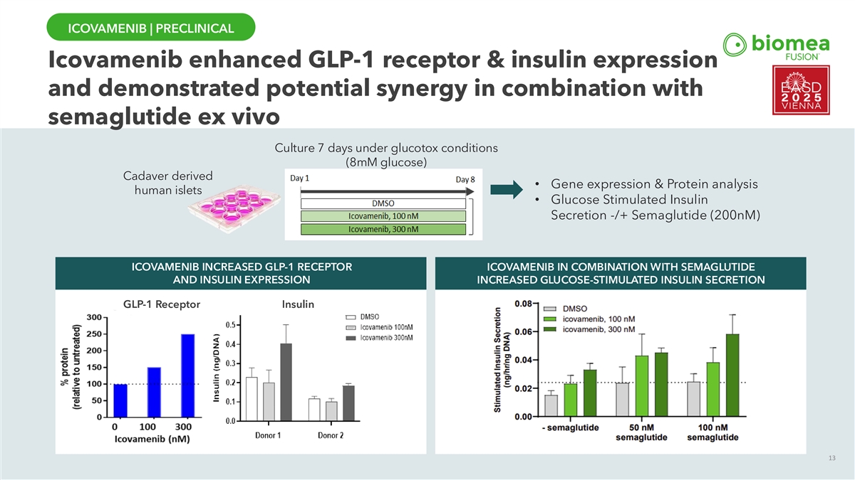 ICOVAMENIB | PRECLINICAL ICOVAMENIB | PRECLINIAL Icovamenib enhanced GLP-1 receptor & insulin expression and demonstrated potential synergy in combination with semaglutide ex vivo Culture 7 days under glucotox conditions (8mM glucose) Cadaver derived • Gene expression & Protein analysis human islets • Glucose Stimulated Insulin Secretion -/+ Semaglutide (200nM) ICOVAMENIB INCREASED GLP-1 RECEPTOR ICOVAMENIB IN COMBINATION WITH SEMAGLUTIDE AND INSULIN EXPRESSION INCREASED GLUCOSE-STIMULATED INSULIN SECRETION GLP-1 Receptor Insulin 13 13