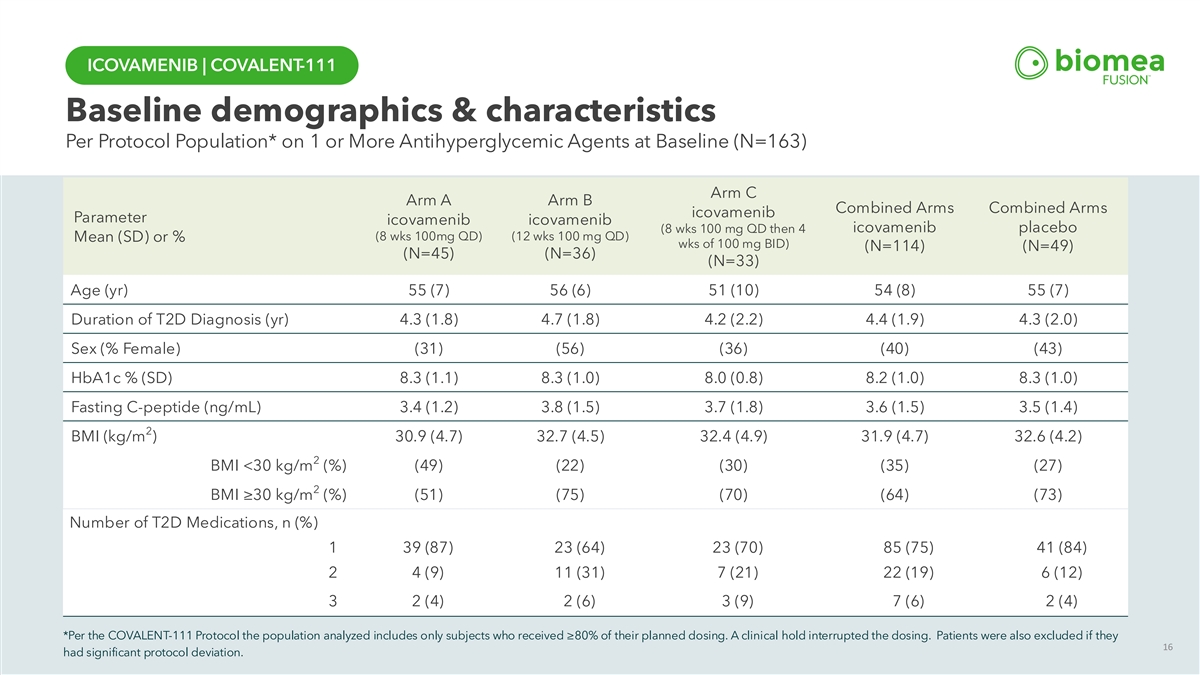 ICOVAMENIB | COVALENT-111 Baseline demographics & characteristics Per Protocol Population* on 1 or More Antihyperglycemic Agents at Baseline (N=163) Arm C Arm A Arm B Combined Arms Combined Arms icovamenib Parameter icovamenib icovamenib (8 wks 100 mg QD then 4 icovamenib placebo (8 wks 100mg QD) (12 wks 100 mg QD) Mean (SD) or % wks of 100 mg BID) (N=114) (N=49) (N=45) (N=36) (N=33) Age (yr) 55 (7) 56 (6) 51 (10) 54 (8) 55 (7) Duration of T2D Diagnosis (yr) 4.3 (1.8) 4.7 (1.8) 4.2 (2.2) 4.4 (1.9) 4.3 (2.0) Sex (% Female) (31) (56) (36) (40) (43) HbA1c % (SD) 8.3 (1.1) 8.3 (1.0) 8.0 (0.8) 8.2 (1.0) 8.3 (1.0) Fasting C-peptide (ng/mL) 3.4 (1.2) 3.8 (1.5) 3.7 (1.8) 3.6 (1.5) 3.5 (1.4) 2 BMI (kg/m ) 30.9 (4.7) 32.7 (4.5) 32.4 (4.9) 31.9 (4.7) 32.6 (4.2) 2 BMI <30 kg/m (%) (49) (22) (30) (35) (27) 2 BMI ≥30 kg/m (%) (51) (75) (70) (64) (73) Number of T2D Medications, n (%) 1 39 (87) 23 (64) 23 (70) 85 (75) 41 (84) 2 4 (9) 11 (31) 7 (21) 22 (19) 6 (12) 3 2 (4) 2 (6) 3 (9) 7 (6) 2 (4) *Per the COVALENT-111 Protocol the population analyzed includes only subjects who received ≥80% of their planned dosing. A clinical hold interrupted the dosing. Patients were also excluded if they 16 had significant protocol deviation.