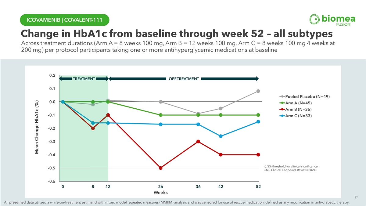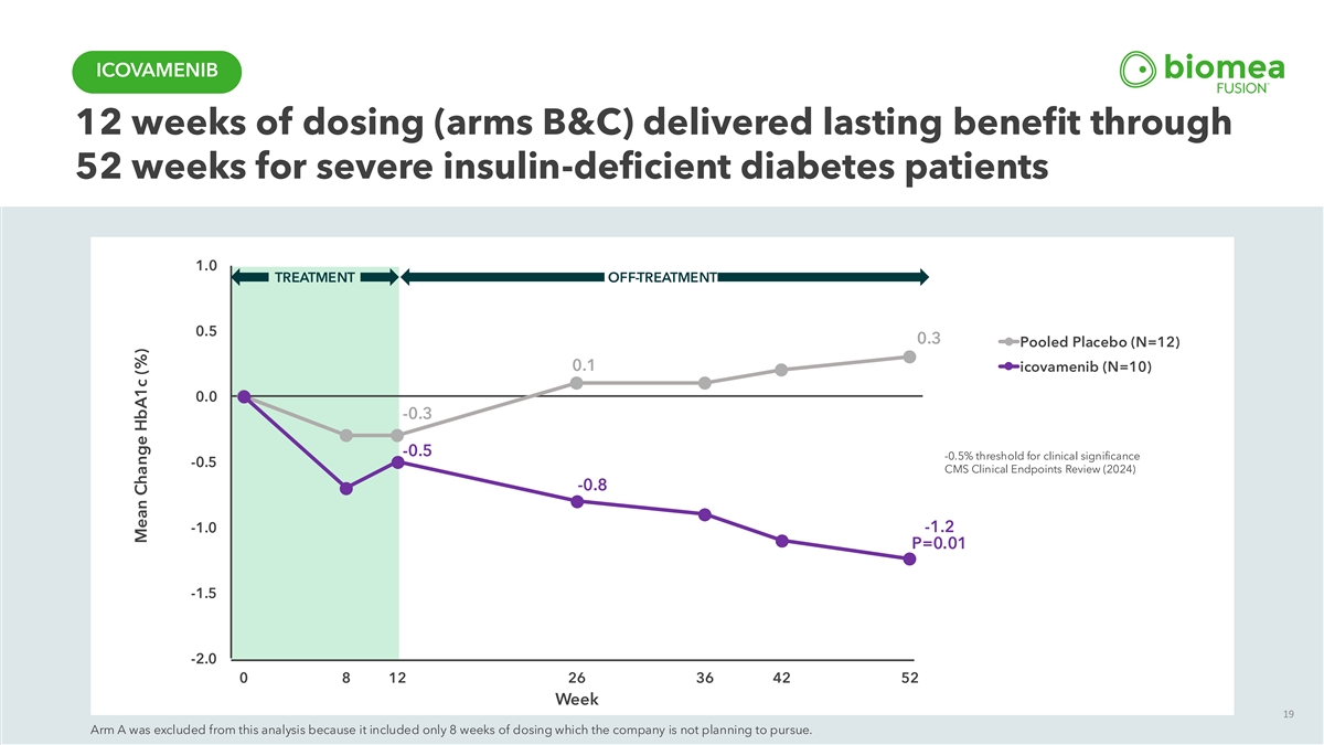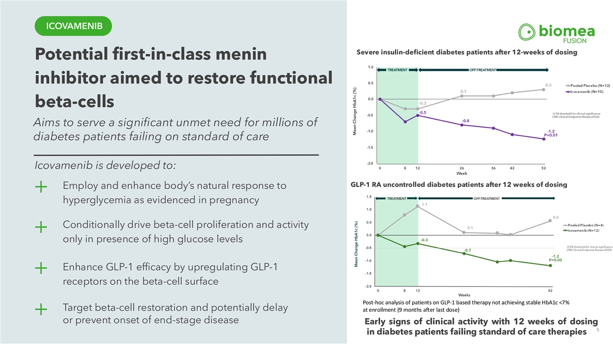ICOVAMENIB 12 weeks of dosing (arms B&C) delivered lasting benefit through 52 weeks for severe insulin-deficient diabetes patients 1.0 INITIAL TARGET TREATMENT OFF-TREATMENT POPULATION FOR ICOVAMENIB 0.5 0.3 Pooled Placebo (N=12) 0.1 icovamenib (N=10) 0.0 -0.3 -0.5 -0.5% threshold for clinical significance -0.5 CMS Clinical Endpoints Review (2024) -0.8 -1.0 -1.2 P=0.01 -1.5 -2.0 0 8 12 26 36 42 52 Week 19 Arm A was excluded from this analysis because it included only 8 weeks of dosing which the company is not planning to pursue. Mean Change HbA1c (%)