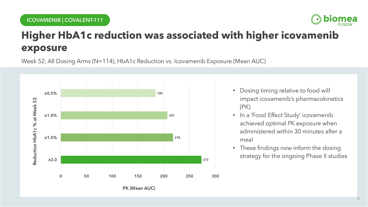 ICOVAMENIB | COVALENT-111 Change in HbA1c from baseline through week 52 – all subtypes Across treatment durations (Arm A = 8 weeks 100 mg, Arm B = 12 weeks 100 mg, Arm C = 8 weeks 100 mg 4 weeks at 200 mg) per protocol participants taking one or more antihyperglycemic medications at baseline 0.2 TREATMENT OFF-TREATMENT 0.1 Pooled Placebo (N=49) 0.0 Arm A (N=45) Arm B (N=36) -0.1 Arm C (N=33) -0.2 -0.3 -0.4 -0.5% threshold for clinical significance -0.5 CMS Clinical Endpoints Review (2024) -0.6 0 8 12 26 36 42 52 Weeks 17 All presented data utilized a while-on-treatment estimand with mixed model repeated measures (MMRM) analysis and was censored for use of rescue medication, defined as any modification in anti-diabetic therapy. Mean Change HbA1c (%)