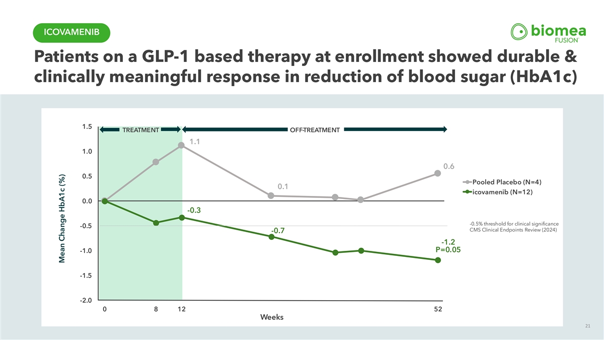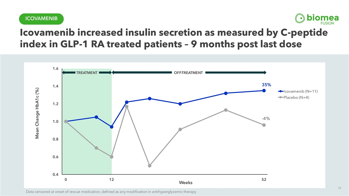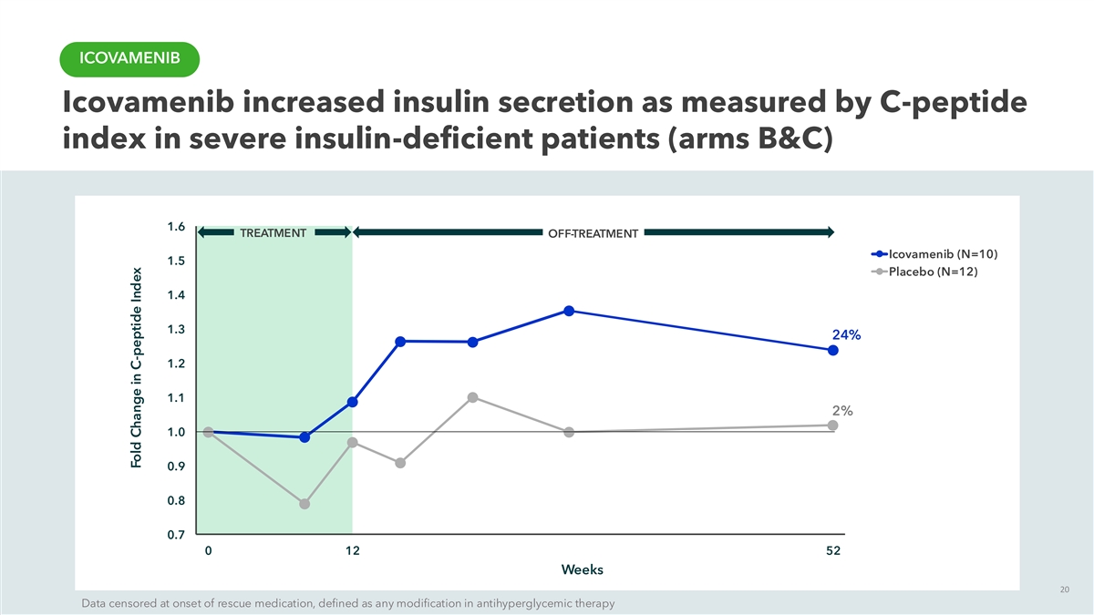 ICOVAMENIB Icovamenib increased insulin secretion as measured by C-peptide index in severe insulin-deficient patients (arms B&C) 1.6 TREATMENT OFF-TREATMENT Icovamenib (N=10) 1.5 Placebo (N=12) 1.4 1.3 24% 1.2 1.1 2% 1.0 0.9 0.8 0.7 0 12 52 Weeks 20 Data censored at onset of rescue medication, defined as any modification in antihyperglycemic therapy Fold Change in C-peptide Index