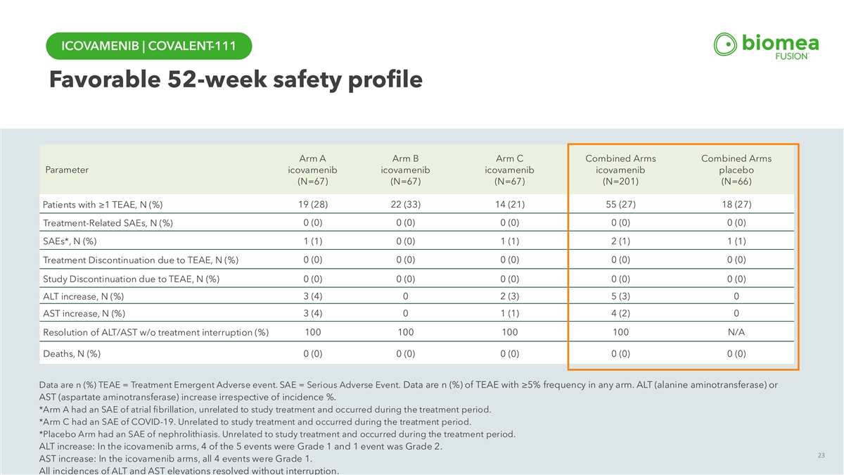 ICOVAMENIB Icovamenib increased insulin secretion as measured by C-peptide index in GLP-1 RA treated patients – 9 months post last dose 1.6 TREATMENT OFF-TREATMENT 35% 1.4 Icovamenib (N=11) Placebo (N=4) 1.2 -4% 1.0 0.8 0.6 0.4 0 12 52 Weeks 22 Data censored at onset of rescue medication, defined as any modification in antihyperglycemic therapy Mean Change HbA1c (%)