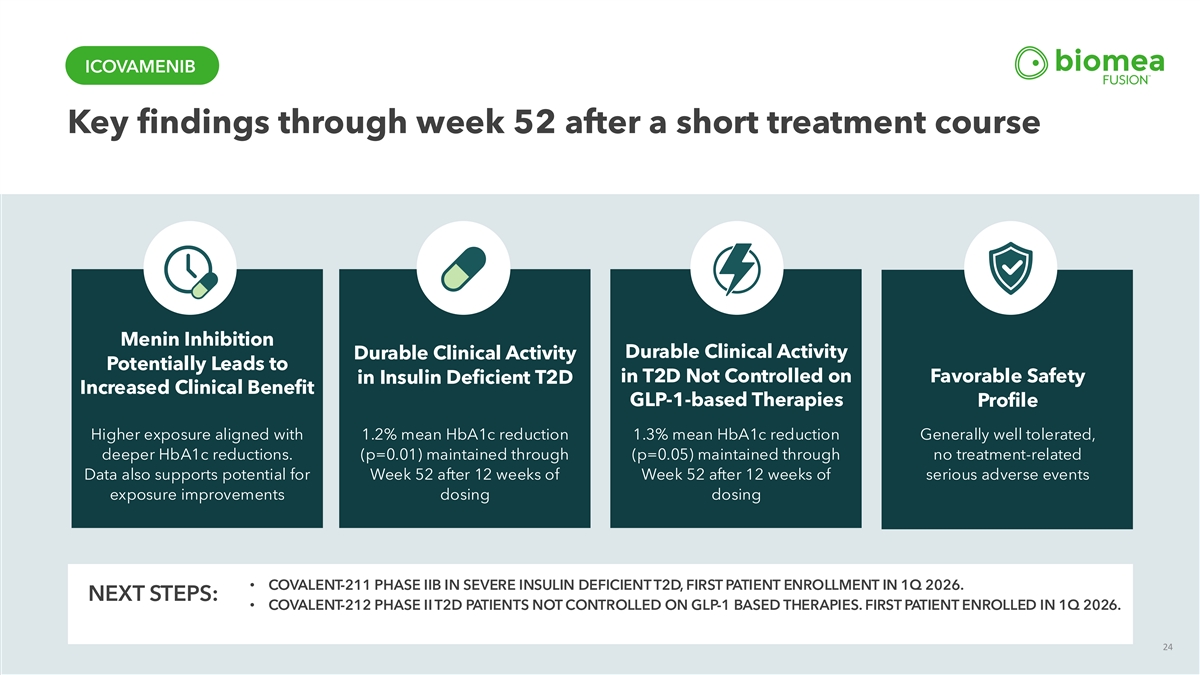 ICOVAMENIB Key findings through week 52 after a short treatment course Menin Inhibition Durable Clinical Activity Durable Clinical Activity Potentially Leads to in T2D Not Controlled on Favorable Safety in Insulin Deficient T2D Increased Clinical Benefit GLP-1-based Therapies Profile Higher exposure aligned with 1.2% mean HbA1c reduction 1.3% mean HbA1c reduction Generally well tolerated, deeper HbA1c reductions. (p=0.01) maintained through (p=0.05) maintained through no treatment-related Data also supports potential for Week 52 after 12 weeks of Week 52 after 12 weeks of serious adverse events exposure improvements dosing dosing • COVALENT-211 PHASE IIB IN SEVERE INSULIN DEFICIENT T2D, FIRST PATIENT ENROLLMENT IN 1Q 2026. NEXT STEPS: • COVALENT-212 PHASE II T2D PATIENTS NOT CONTROLLED ON GLP-1 BASED THERAPIES. FIRST PATIENT ENROLLED IN 1Q 2026. 24