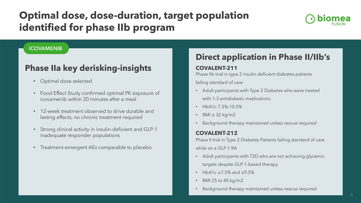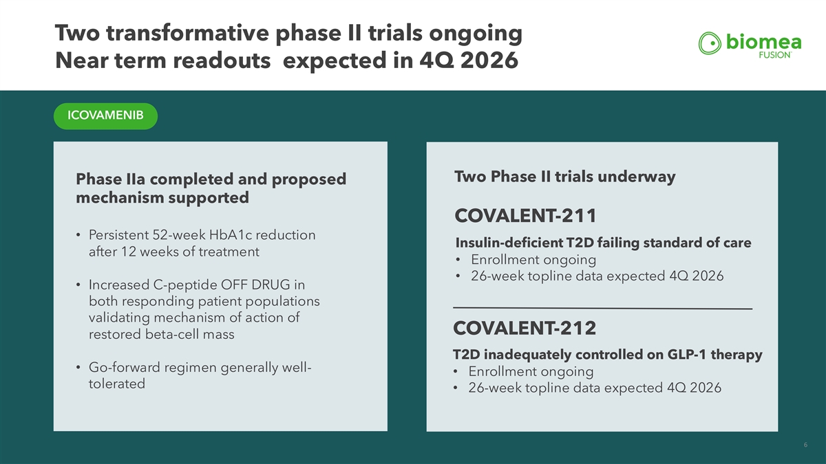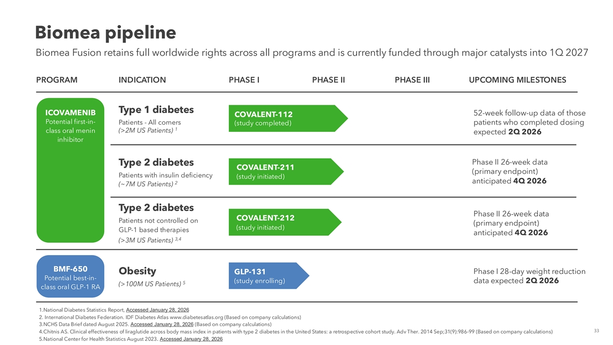 Biomea Fusion pipeline – targeting diabetes & obesity Biomea Fusion retains full worldwide rights across all programs Program Indications Pre-clinical Phase I Phase II Phase III Key Catalysts Phase II 26-week data Type 2 diabetes (study initiated) ICOVAMENIB COVALENT-211 (primary endpoint) Patients with Insulin- deficiency anticipated 4Q 2026 Type 2 diabetes Phase II 26-week data ICOVAMENIB (study initiated) COVALENT-212 Patients not controlled on (primary endpoint) GLP-1-based therapies anticipated 4Q 2026 52-week follow-up data Type 2 diabetes (study completed) COVALENT-111 presented 4Q 2025 Patients – all comers ICOVAMENIB Type 1 diabetes 52-week follow-up data (study completed) COVALENT-112 Patients – all comers expected in Q2 2026 Phase I weight reduction BMF-650 (study enrolling) GLP-131 Obesity data expected Q2 2026 4