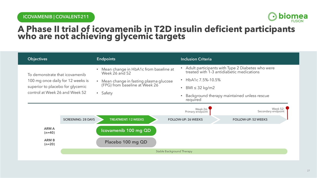 Optimal dose, dose-duration, target population identified for phase IIb program ICOVAMENIB Direct application in Phase II/IIb’s COVALENT-211 Phase IIa key derisking-insights Phase IIb trial in type 2 insulin deficient diabetes patients • Optimal dose selected failing standard of care • Adult participants with Type 2 Diabetes who were treated • Food Effect Study confirmed optimal PK exposure of with 1-3 antidiabetic medications icovamenib within 30 minutes after a meal • HbA1c 7.5%-10.5% • 12-week treatment observed to drive durable and • BMI ≤ 32 kg/m2 lasting effects, no chronic treatment required • Background therapy maintained unless rescue required • Strong clinical activity in insulin-deficient and GLP-1 COVALENT-212 inadequate responder populations Phase II trial in Type 2 Diabetes Patients failing standard of care • Treatment-emergent AEs comparable to placebo while on a GLP-1 RA • Adult participants with T2D who are not achieving glycemic targets despite GLP-1-based therapy • HbA1c ≥7.5% and ≤9.5% • BMI 25 to 40 kg/m2 • Background therapy maintained unless rescue required 26
