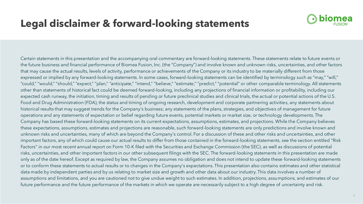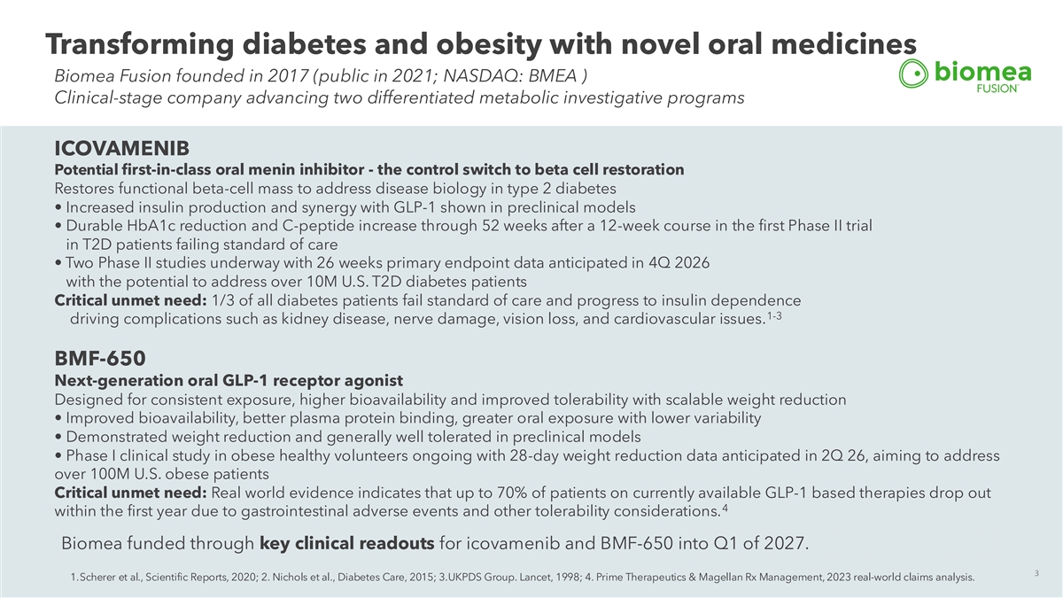 Legal disclaimer & forward-looking statements Certain statements in this presentation and the accompanying oral commentary are forward-looking statements. These statements relate to future events or the future business and financial performance of Biomea Fusion, Inc. (the “Company”) and involve known and unknown risks, uncertainties, and other factors that may cause the actual results, levels of activity, performance or achievements of the Company or its industry to be materially different from those expressed or implied by any forward-looking statements. In some cases, forward-looking statements can be identified by terminology such as “may,” “will,” “could,” “would,” “should,” “expect,” “plan,” “anticipate,” “intend,” “believe,” “estimate,” “predict,” “potential” or other comparable terminology. All statements other than statements of historical fact could be deemed forward-looking, including any projections of financial information or profitability, including our expected cash runway, the initiation, timing and results of pending or future preclinical studies and clinical trials, the actual or potential actions of the U.S. Food and Drug Administration (FDA), the status and timing of ongoing research, development and corporate partnering activities, any statements about historical results that may suggest trends for the Company's business; any statements of the plans, strategies, and objectives of management for future operations and any statements of expectation or belief regarding future events, potential markets or market size, or technology developments. The Company has based these forward-looking statements on its current expectations, assumptions, estimates, and projections. While the Company believes these expectations, assumptions, estimates and projections are reasonable, such forward-looking statements are only predictions and involve known and unknown risks and uncertainties, many of which are beyond the Company's control. For a discussion of these and other risks and uncertainties, and other important factors, any of which could cause our actual results to differ from those contained in the forward-looking statements, see the section entitled Risk Factors in our most recent annual report on Form 10-K filed with the Securities and Exchange Commission (the SEC), as well as discussions of potential risks, uncertainties, and other important factors in our other subsequent filings with the SEC. The forward-looking statements in this presentation are made only as of the date hereof. Except as required by law, the Company assumes no obligation and does not intend to update these forward-looking statements or to conform these statements to actual results or to changes in the Company's expectations. This presentation also contains estimates and other statistical data made by independent parties and by us relating to market size and growth and other data about our industry. This data involves a number of assumptions and limitations, and you are cautioned not to give undue weight to such estimates. In addition, projections, assumptions, and estimates of our future performance and the future performance of the markets in which we operate are necessarily subject to a high degree of uncertainty and risk. 2