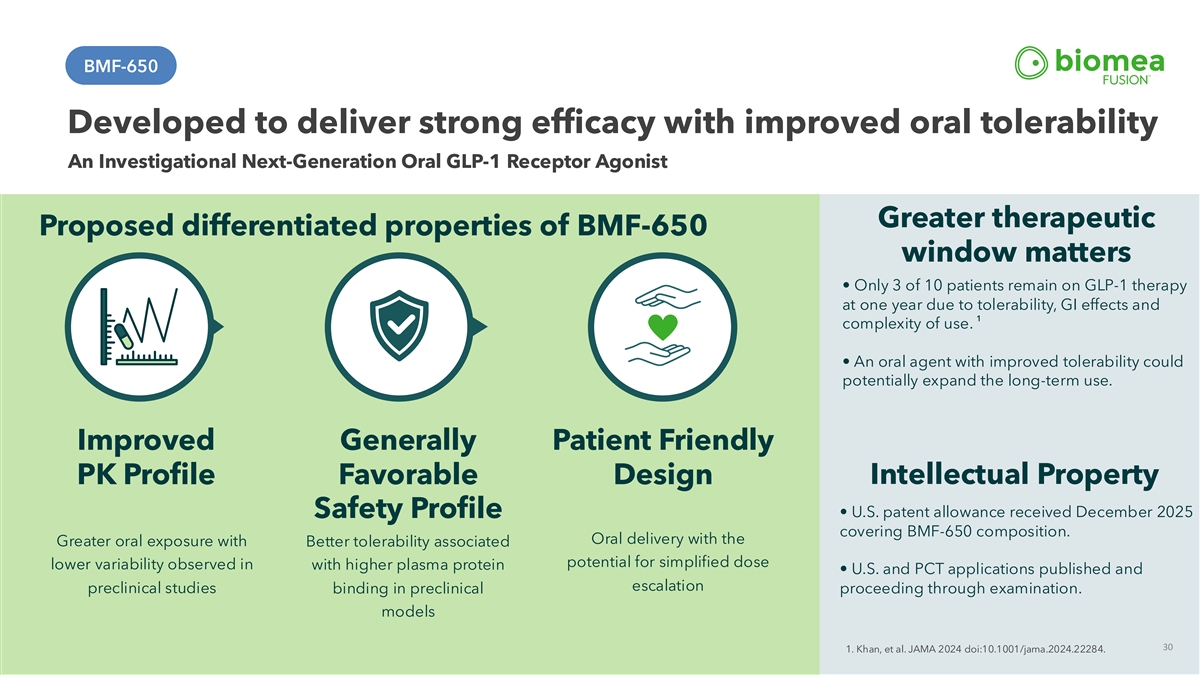 BMF-650 Developed to deliver strong efficacy with improved oral tolerability An Investigational Next-Generation Oral GLP-1 Receptor Agonist Greater therapeutic Proposed differentiated properties of BMF-650 window matters • Only 3 of 10 patients remain on GLP-1 therapy at one year due to tolerability, GI effects and 1 complexity of use. • An oral agent with improved tolerability could potentially expand the long-term use. Improved Generally Patient Friendly PK Profile Favorable Design Intellectual Property • U.S. patent allowance received December 2025 Safety Profile covering BMF-650 composition. Oral delivery with the Greater oral exposure with Better tolerability associated potential for simplified dose lower variability observed in with higher plasma protein • U.S. and PCT applications published and escalation preclinical studies binding in preclinical proceeding through examination. models 30 1. Khan, et al. JAMA 2024 doi:10.1001/jama.2024.22284.