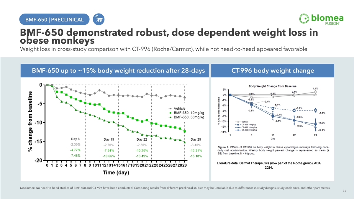 BMF-650 | PRECLINICAL BMF-650 | PRECLINICAL BMF-650 demonstrated robust, dose dependent weight loss in obese monkeys Weight loss in cross-study comparison with CT-996 (Roche/Carmot), while not head-to-head appeared favorable BMF-650 up to ~15% body weight reduction after 28-days CT-996 body weight change Literature data; Carmot Therapeutics (now part of the Roche group), ADA 2024. Disclaimer: No head-to-head studies of BMF-650 and CT-996 have been conducted. Comparing results from different preclinical studies may be unreliable due to differences in study designs, study endpoints, and other parameters. 31