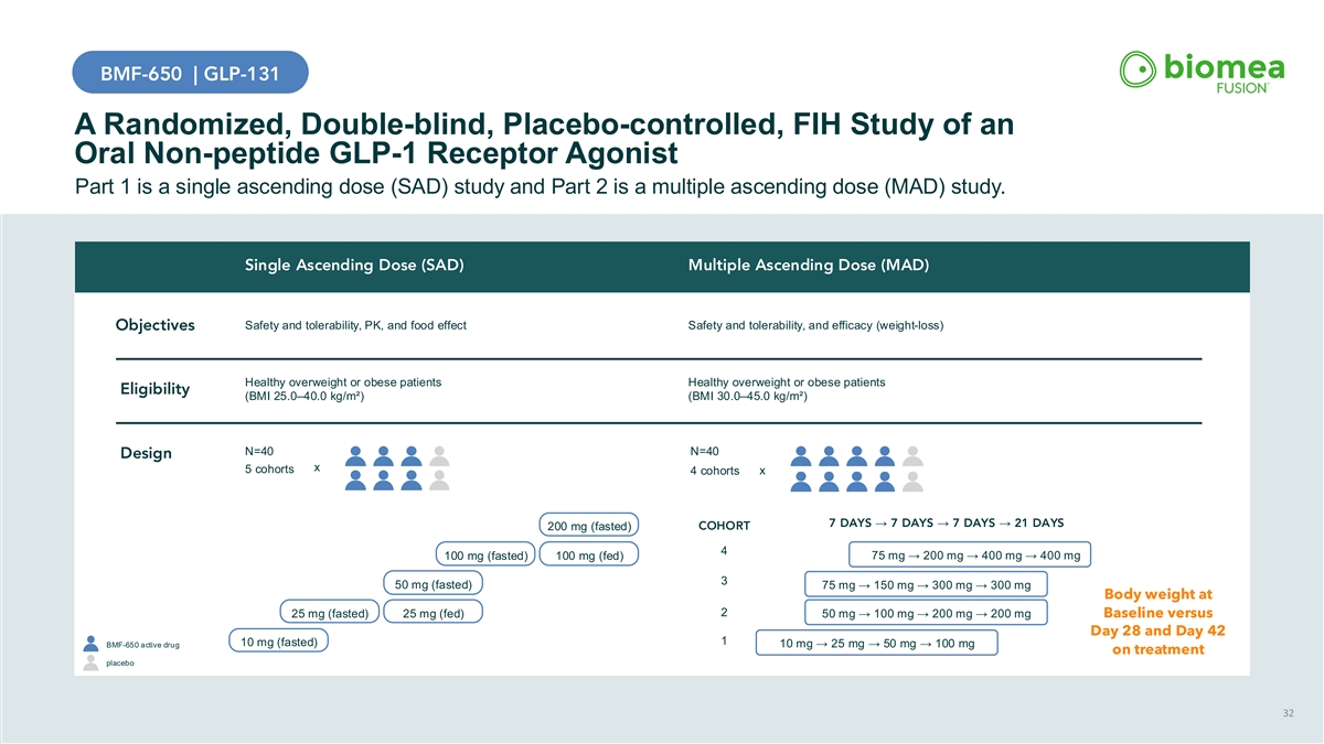 BMF-650 | GLP-131 A Randomized, Double-blind, Placebo-controlled, FIH Study of an Oral Non-peptide GLP-1 Receptor Agonist Part 1 is a single ascending dose (SAD) study and Part 2 is a multiple ascending dose (MAD) study. Single Ascending Dose (SAD) Multiple Ascending Dose (MAD) Safety and tolerability, PK, and food effect Safety and tolerability, and efficacy (weight-loss) Objectives Healthy overweight or obese patients Healthy overweight or obese patients Eligibility (BMI 25.0–40.0 kg/m²) (BMI 30.0–45.0 kg/m²) N=40 N=40 Design x 5 cohorts x 4 cohorts 7 DAYS → 7 DAYS → 7 DAYS → 21 DAYS 200 mg (fasted) COHORT 4 100 mg (fasted) 100 mg (fed) 75 mg → 200 mg → 400 mg → 400 mg 3 50 mg (fasted) 75 mg → 150 mg → 300 mg → 300 mg Body weight at 2 25 mg (fasted) 25 mg (fed) 50 mg → 100 mg → 200 mg → 200 mg Baseline versus Day 28 and Day 42 1 10 mg (fasted) BMF-650 active drug 10 mg → 25 mg → 50 mg → 100 mg on treatment placebo 32