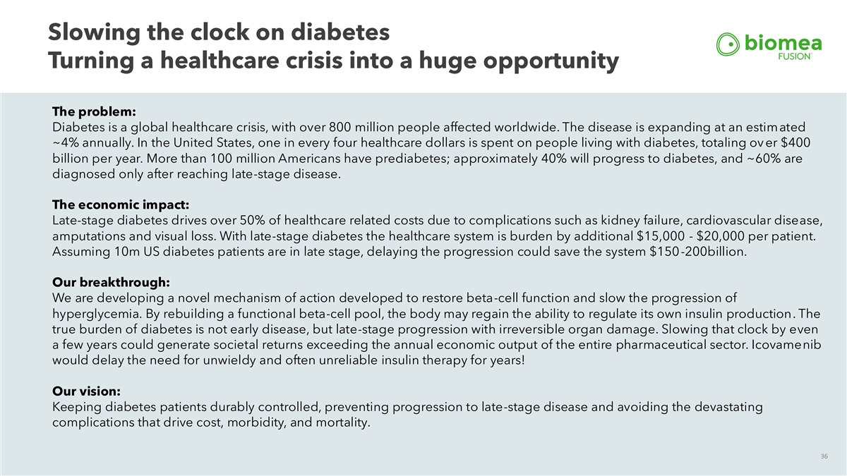 Slowing the clock on diabetes Turning a healthcare crisis into a huge opportunity The problem: Diabetes is a global healthcare crisis, with over 800 million people affected worldwide. The disease is expanding at an estimated ~4% annually. In the United States, one in every four healthcare dollars is spent on people living with diabetes, totaling ov er $400 billion per year. More than 100 million Americans have prediabetes; approximately 40% will progress to diabetes, and ~60% are diagnosed only after reaching late-stage disease. The economic impact: Late-stage diabetes drives over 50% of healthcare related costs due to complications such as kidney failure, cardiovascular disease, amputations and visual loss. With late-stage diabetes the healthcare system is burden by additional $15,000 - $20,000 per patient. Assuming 10m US diabetes patients are in late stage, delaying the progression could save the system $150-200billion. Our breakthrough: We are developing a novel mechanism of action developed to restore beta-cell function and slow the progression of hyperglycemia. By rebuilding a functional beta-cell pool, the body may regain the ability to regulate its own insulin production. The true burden of diabetes is not early disease, but late-stage progression with irreversible organ damage. Slowing that clock by even a few years could generate societal returns exceeding the annual economic output of the entire pharmaceutical sector. Icovamenib would delay the need for unwieldy and often unreliable insulin therapy for years! Our vision: Keeping diabetes patients durably controlled, preventing progression to late-stage disease and avoiding the devastating complications that drive cost, morbidity, and mortality. 36