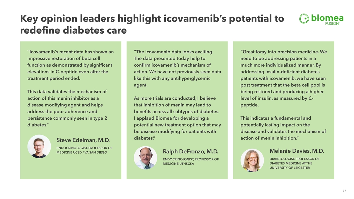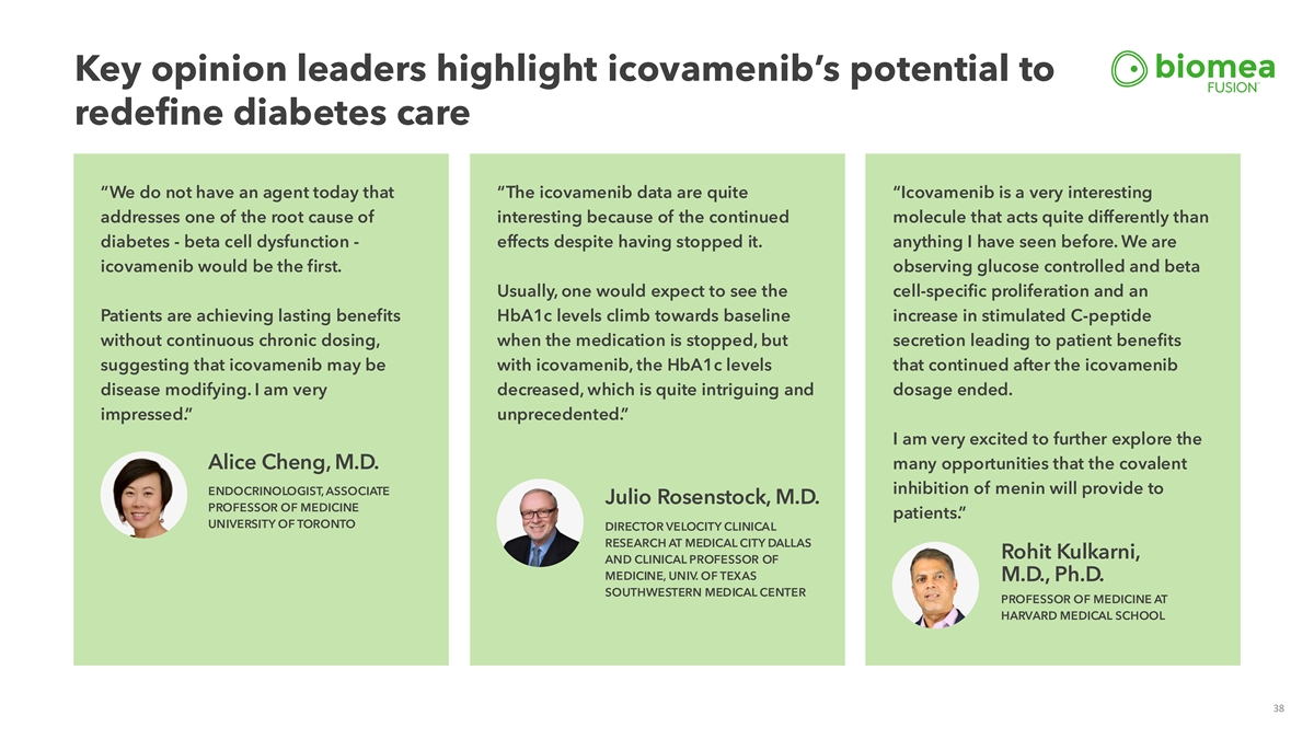 Key opinion leaders highlight icovamenib’s potential to redefine diabetes care “Icovamenib's recent data has shown an “The icovamenib data looks exciting. “Great foray into precision medicine. We impressive restoration of beta cell The data presented today help to need to be addressing patients in a function as demonstrated by significant confirm icovamenib’s mechanism of much more individualized manner. By elevations in C-peptide even after the action. We have not previously seen data addressing insulin-deficient diabetes treatment period ended. like this with any antihyperglycemic patients with icovamenib, we have seen agent. post treatment that the beta cell pool is This data validates the mechanism of being restored and producing a higher action of this menin inhibitor as a As more trials are conducted, I believe level of insulin, as measured by C- disease modifying agent and helps that inhibition of menin may lead to peptide. address the poor adherence and benefits across all subtypes of diabetes. persistence commonly seen in type 2 I applaud Biomea for developing a This indicates a fundamental and diabetes.” potential new treatment option that may potentially lasting impact on the be disease modifying for patients with disease and validates the mechanism of diabetes.” action of menin inhibition.” Steve Edelman, M.D. ENDOCRINOLOGIST, PROFESSOR OF Melanie Davies, M.D. Ralph DeFronzo, M.D. MEDICINE UCSD / VA SAN DIEGO DIABETOLOGIST, PROFESSOR OF ENDOCRINOLOGIST, PROFESSOR OF DIABETES MEDICINE AT THE MEDICINE UTHSCSA UNIVERSITY OF LEICESTER 37