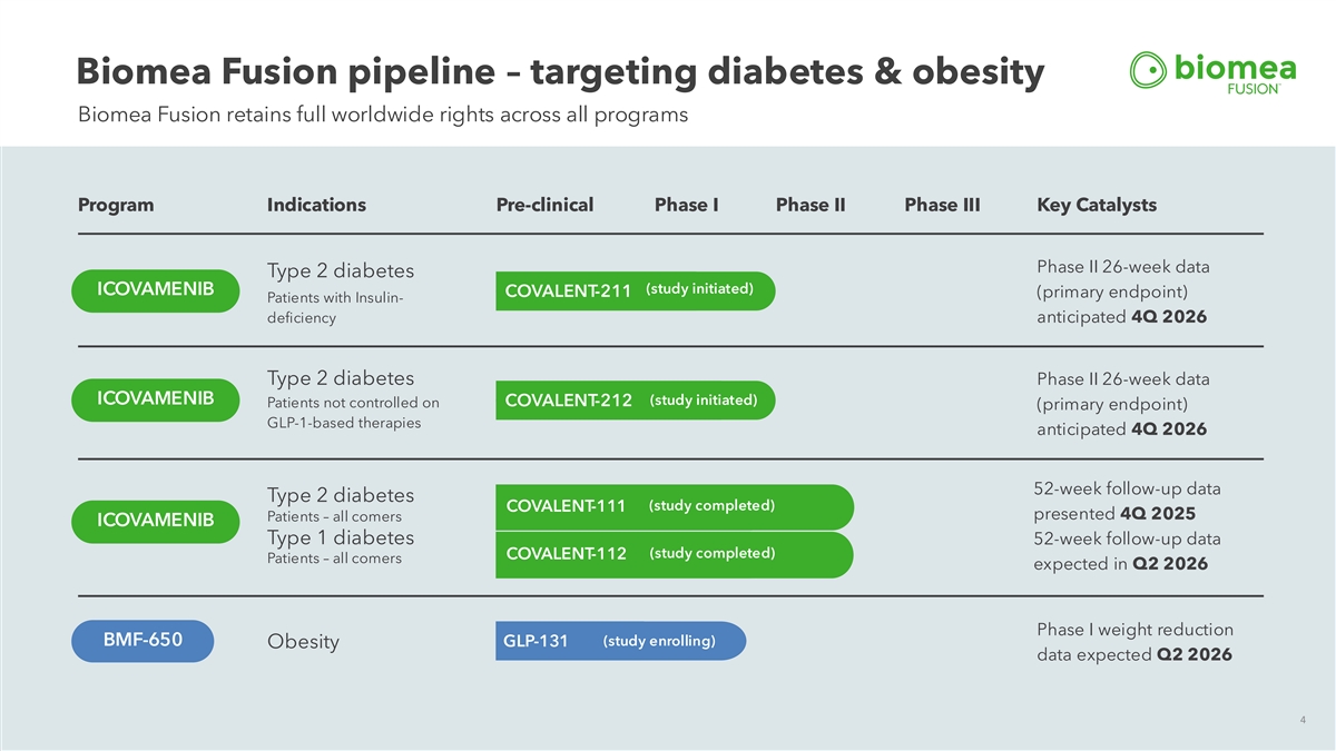 Transforming diabetes and obesity with novel oral medicines Biomea Fusion founded in 2017 (public in 2021; NASDAQ: BMEA ) Clinical-stage company advancing two differentiated metabolic investigative programs ICOVAMENIB Potential first-in-class oral menin inhibitor - the control switch to beta cell restoration Restores functional beta-cell mass to address disease biology in type 2 diabetes • Increased insulin production and synergy with GLP-1 shown in preclinical models • Durable HbA1c reduction and C-peptide increase through 52 weeks after a 12-week course in the first Phase II trial in T2D patients failing standard of care • Two Phase II studies underway with 26 weeks primary endpoint data anticipated in 4Q 2026 with the potential to address over 10M U.S. T2D diabetes patients Critical unmet need: 1/3 of all diabetes patients fail standard of care and progress to insulin dependence 1-3 driving complications such as kidney disease, nerve damage, vision loss, and cardiovascular issues. BMF-650 Next-generation oral GLP-1 receptor agonist Designed for consistent exposure, higher bioavailability and improved tolerability with scalable weight reduction • Improved bioavailability, better plasma protein binding, greater oral exposure with lower variability • Demonstrated weight reduction and generally well tolerated in preclinical models • Phase I clinical study in obese healthy volunteers ongoing with 28-day weight reduction data anticipated in 2Q 26, aiming to address over 100M U.S. obese patients Critical unmet need: Real world evidence indicates that up to 70% of patients on currently available GLP-1 based therapies drop out 4 within the first year due to gastrointestinal adverse events and other tolerability considerations. Biomea funded through key clinical readouts for icovamenib and BMF-650 into Q1 of 2027. 3 1.Scherer et al., Scientific Reports, 2020; 2. Nichols et al., Diabetes Care, 2015; 3.UKPDS Group. Lancet, 1998; 4. Prime Therapeutics & Magellan Rx Management, 2023 real-world claims analysis.