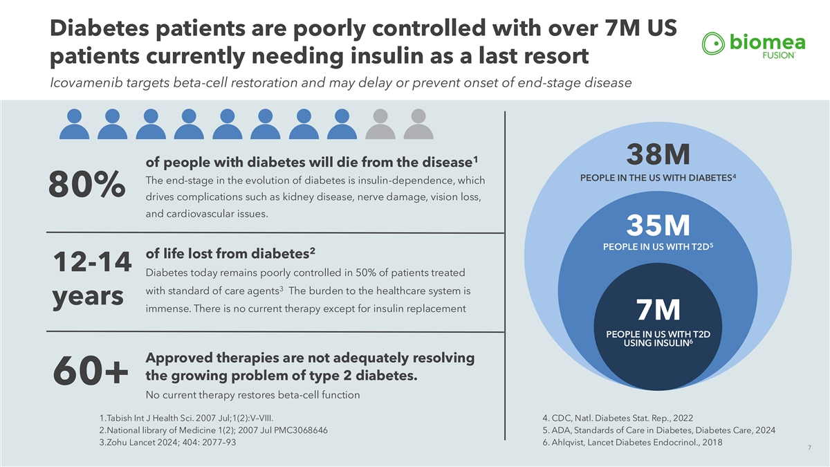 Diabetes patients are poorly controlled with over 7M US patients currently needing insulin as a last resort Icovamenib targets beta-cell restoration and may delay or prevent onset of end-stage disease 1 38M of people with diabetes will die from the disease 4 PEOPLE IN THE US WITH DIABETES The end-stage in the evolution of diabetes is insulin-dependence, which 80% drives complications such as kidney disease, nerve damage, vision loss, and cardiovascular issues. 35M 5 PEOPLE IN US WITH T2D 2 of life lost from diabetes 12-14 Diabetes today remains poorly controlled in 50% of patients treated 3 with standard of care agents The burden to the healthcare system is years immense. There is no current therapy except for insulin replacement 7M PEOPLE IN US WITH T2D 6 USING INSULIN Approved therapies are not adequately resolving the growing problem of type 2 diabetes. 60+ No current therapy restores beta-cell function 1.Tabish Int J Health Sci. 2007 Jul;1(2):V–VIII. 4. CDC, Natl. Diabetes Stat. Rep., 2022 2.National library of Medicine 1(2); 2007 Jul PMC3068646 5. ADA, Standards of Care in Diabetes, Diabetes Care, 2024 3.Zohu Lancet 2024; 404: 2077–93 6. Ahlqvist, Lancet Diabetes Endocrinol., 2018 7