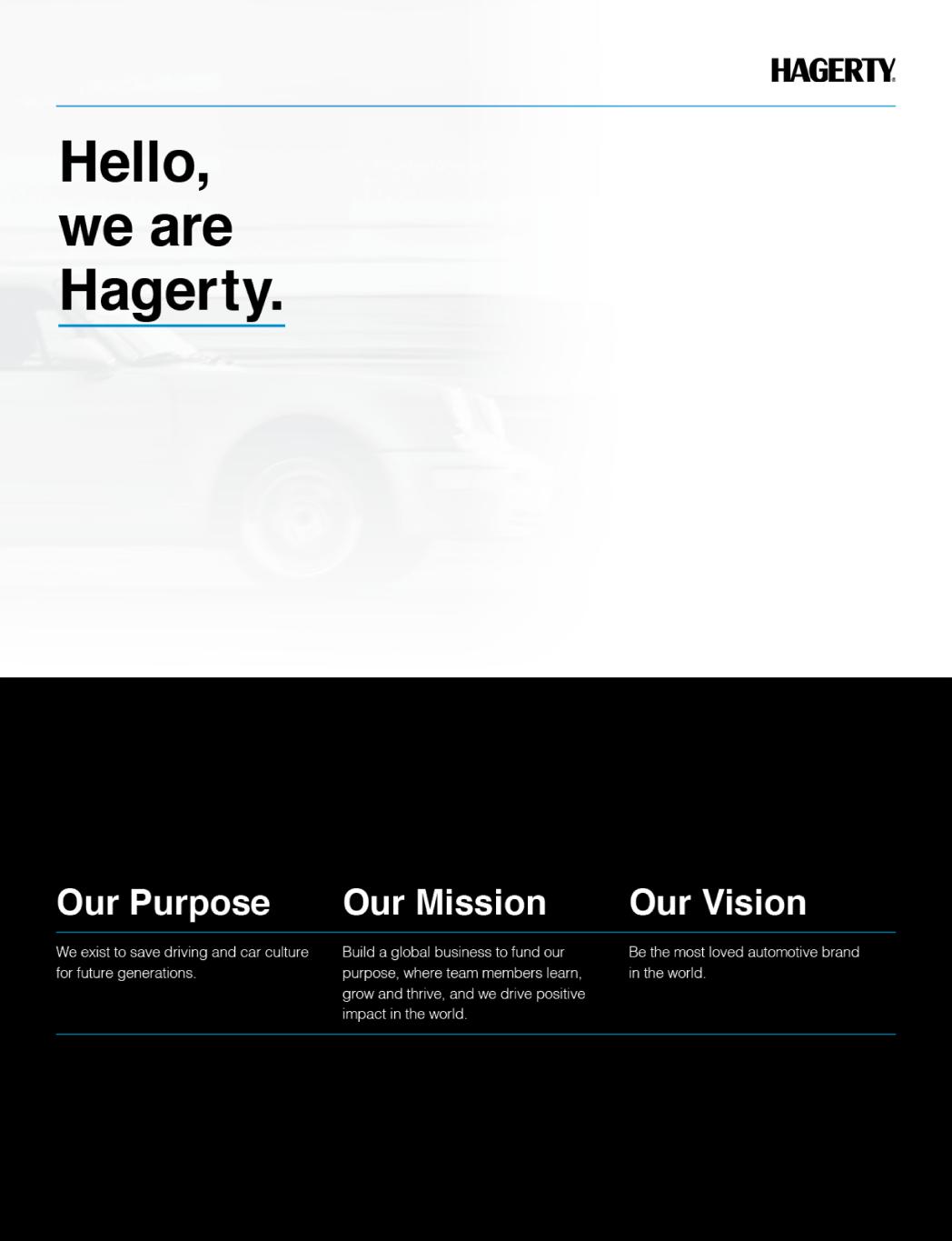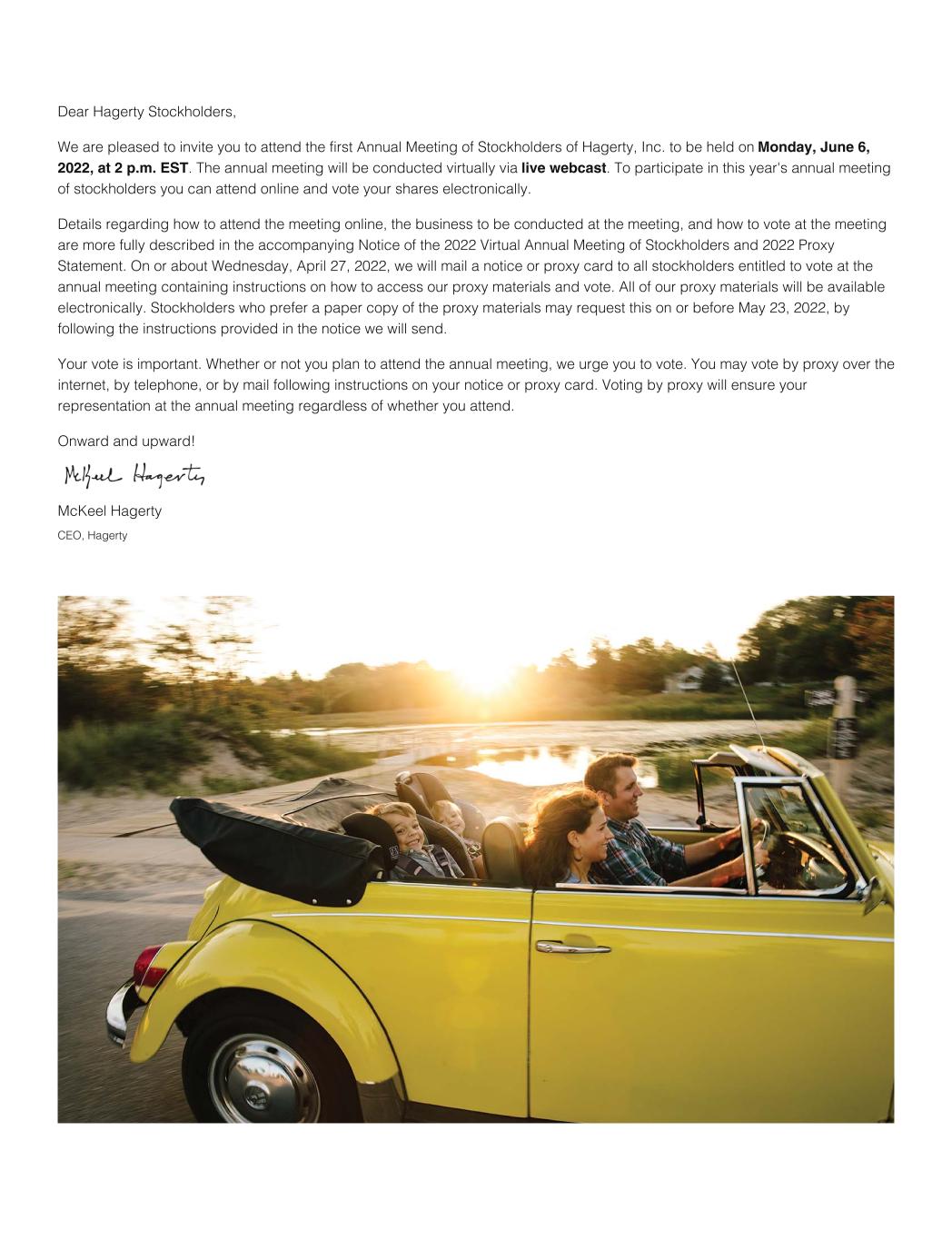 Dear Hagerty Stockholders, We are pleased to invite you to attend the first Annual Meeting of Stockholders of Hagerty, Inc. to be held on Monday, June 6, 2022, at 2 p.m. EST. The annual meeting will be conducted virtually via live webcast. To participate in this year's annual meeting of stockholders you can attend online and vote your shares electronically. Details regarding how to attend the meeting online, the business to be conducted at the meeting, and how to vote at the meeting are more fully described in the accompanying Notice of the 2022 Virtual Annual Meeting of Stockholders and 2022 Proxy Statement. On or about Wednesday, April 27, 2022, we will mail a notice or proxy card to all stockholders entitled to vote at the annual meeting containing instructions on how to access our proxy materials and vote. All of our proxy materials will be available electronically. Stockholders who prefer a paper copy of the proxy materials may request this on or before May 23, 2022, by following the instructions provided in the notice we will send. Your vote is important. Whether or not you plan to attend the annual meeting, we urge you to vote. You may vote by proxy over the internet, by telephone, or by mail following instructions on your notice or proxy card. Voting by proxy will ensure your representation at the annual meeting regardless of whether you attend. Onward and upward! McKeel Hagerty CEO, Hagerty