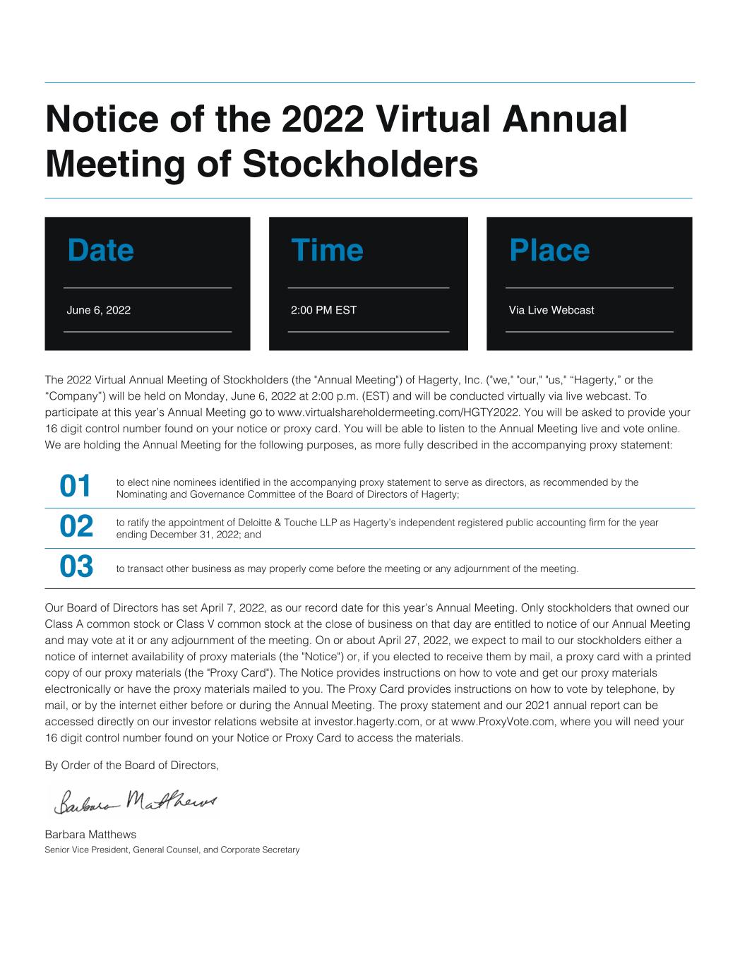 Notice of the 2022 Virtual Annual Meeting of Stockholders Date Time Place June 6, 2022 2:00 PM EST Via Live Webcast The 2022 Virtual Annual Meeting of Stockholders (the "Annual Meeting") of Hagerty, Inc. ("we," "our," "us," “Hagerty,” or the “Company”) will be held on Monday, June 6, 2022 at 2:00 p.m. (EST) and will be conducted virtually via live webcast. To participate at this year’s Annual Meeting go to www.virtualshareholdermeeting.com/HGTY2022. You will be asked to provide your 16 digit control number found on your notice or proxy card. You will be able to listen to the Annual Meeting live and vote online. We are holding the Annual Meeting for the following purposes, as more fully described in the accompanying proxy statement: 01 to elect nine nominees identified in the accompanying proxy statement to serve as directors, as recommended by the Nominating and Governance Committee of the Board of Directors of Hagerty; 02 to ratify the appointment of Deloitte & Touche LLP as Hagerty’s independent registered public accounting firm for the year ending December 31, 2022; and 03 to transact other business as may properly come before the meeting or any adjournment of the meeting. Our Board of Directors has set April 7, 2022, as our record date for this year’s Annual Meeting. Only stockholders that owned our Class A common stock or Class V common stock at the close of business on that day are entitled to notice of our Annual Meeting and may vote at it or any adjournment of the meeting. On or about April 27, 2022, we expect to mail to our stockholders either a notice of internet availability of proxy materials (the "Notice") or, if you elected to receive them by mail, a proxy card with a printed copy of our proxy materials (the "Proxy Card"). The Notice provides instructions on how to vote and get our proxy materials electronically or have the proxy materials mailed to you. The Proxy Card provides instructions on how to vote by telephone, by mail, or by the internet either before or during the Annual Meeting. The proxy statement and our 2021 annual report can be accessed directly on our investor relations website at investor.hagerty.com, or at www.ProxyVote.com, where you will need your 16 digit control number found on your Notice or Proxy Card to access the materials. By Order of the Board of Directors, Barbara Matthews Senior Vice President, General Counsel, and Corporate Secretary